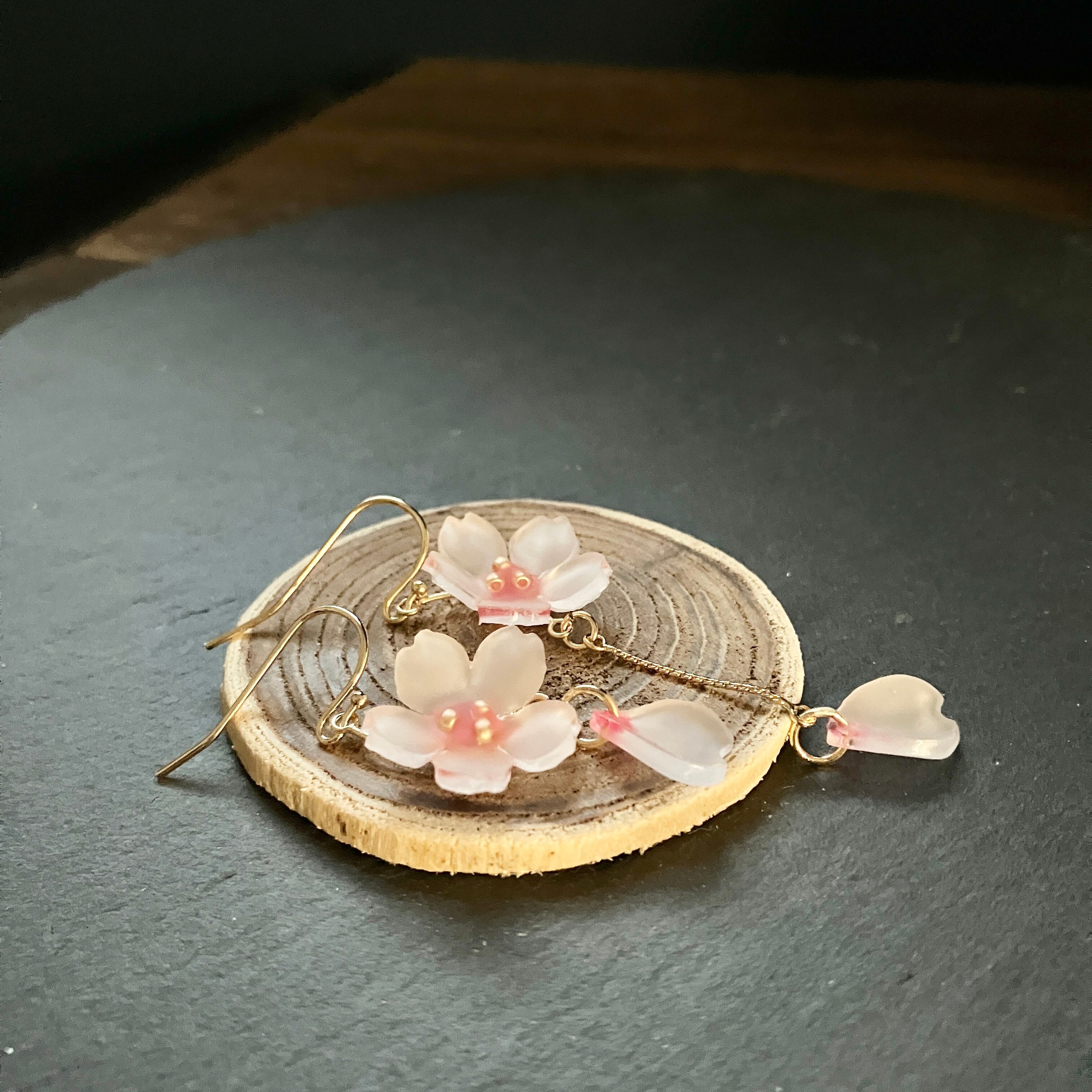 レジンで桜のふんわりとした花とゆらゆら揺れる花びらを作りました。