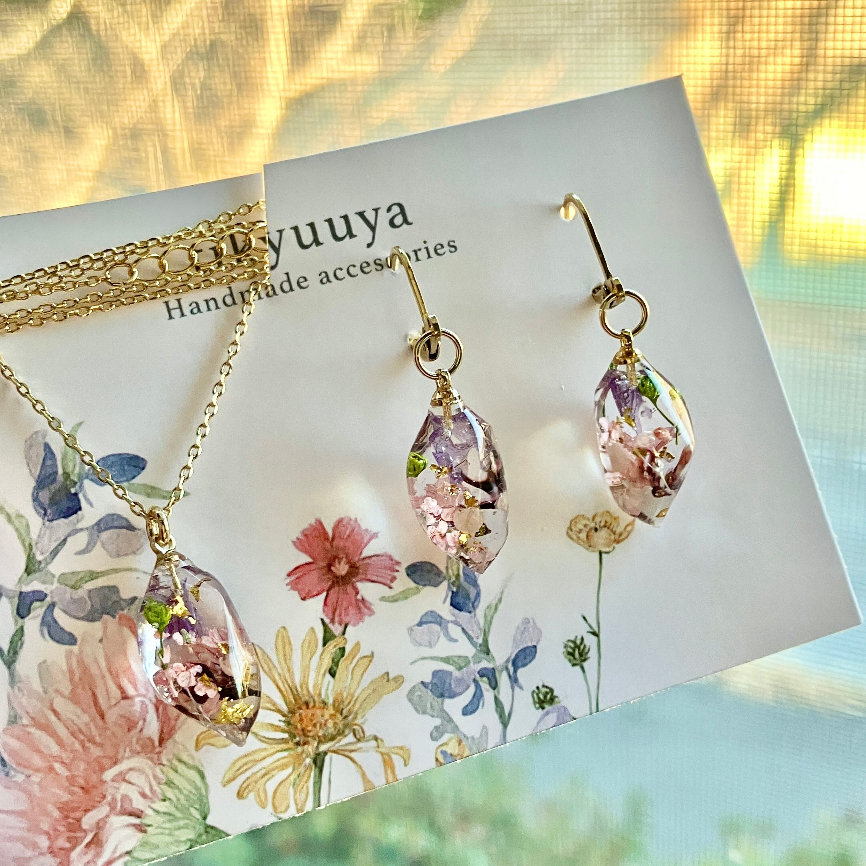 小さな鉱石ピアス&ネックレス 春色花鉱石