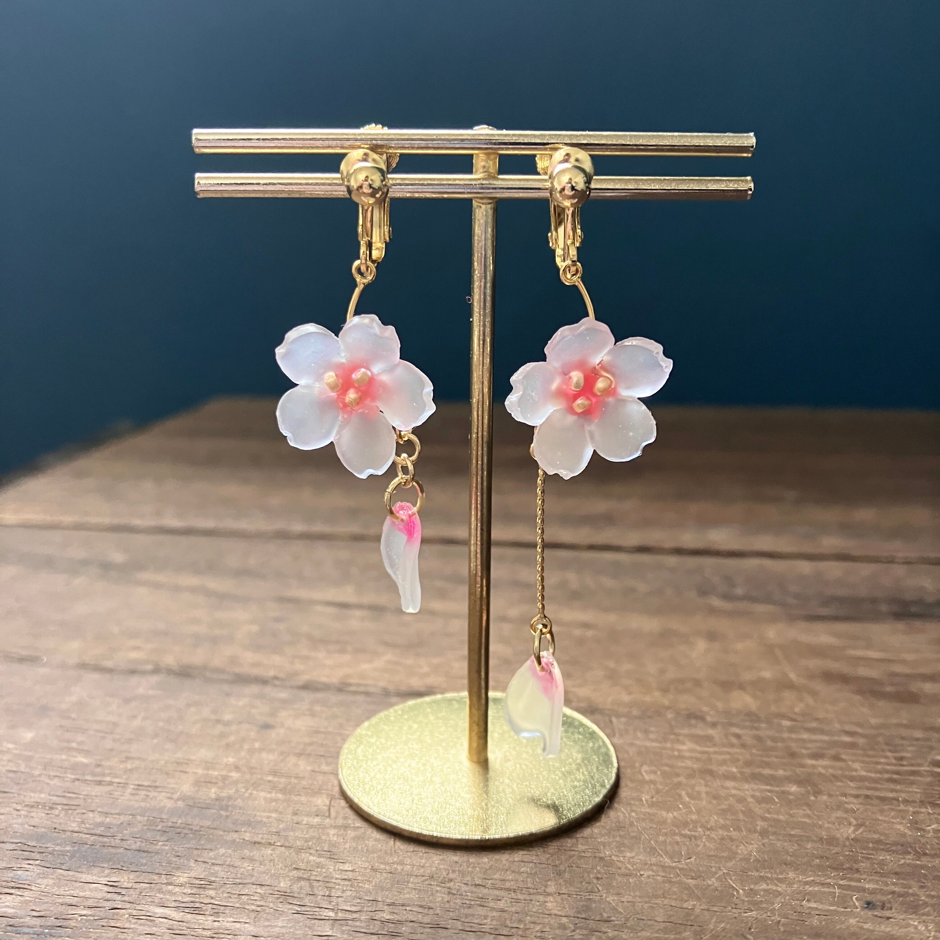 レジンで桜のふんわりとした花とゆらゆら揺れる花びらを作りました。