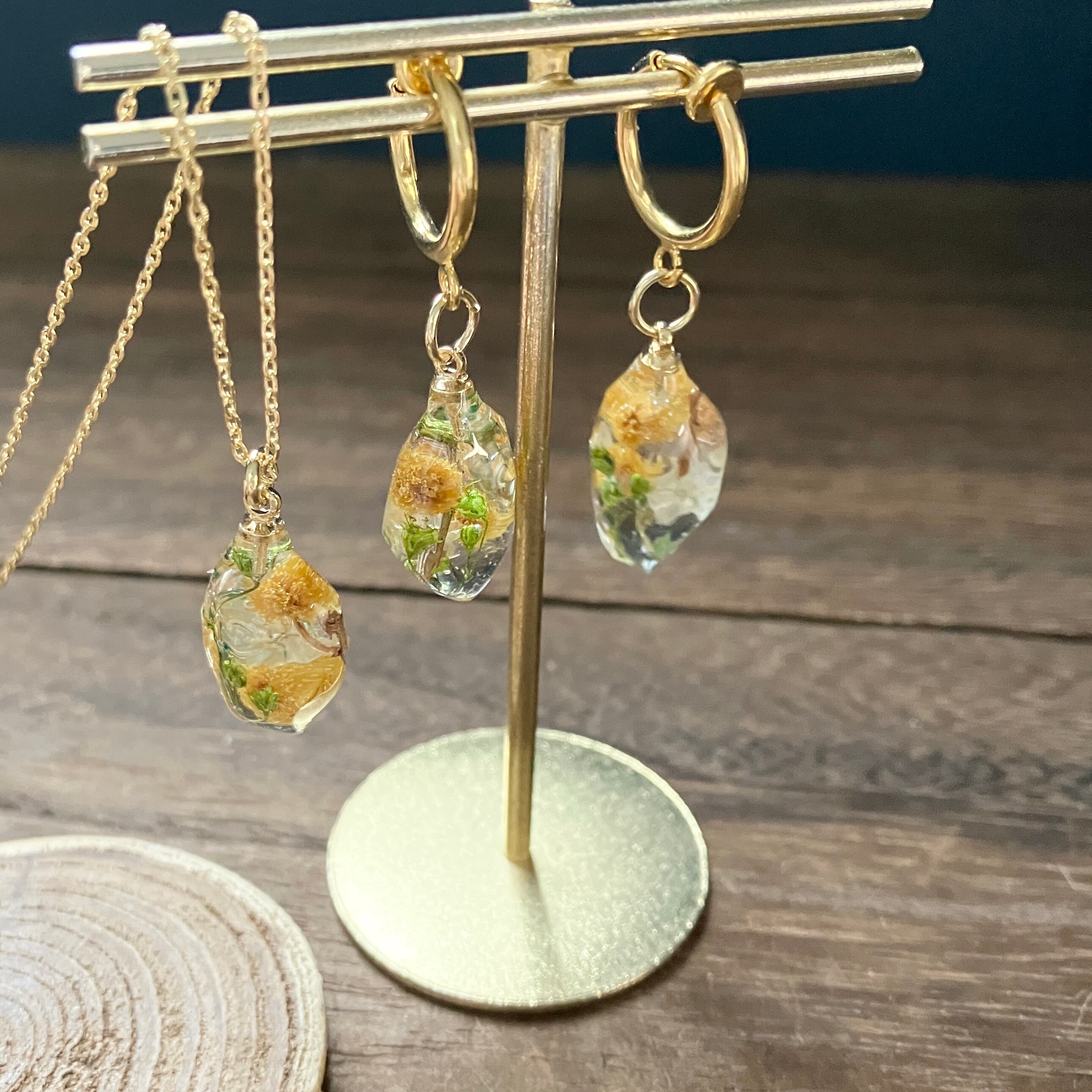 小さな鉱石イヤリング&ネックレス ミモザの花鉱石