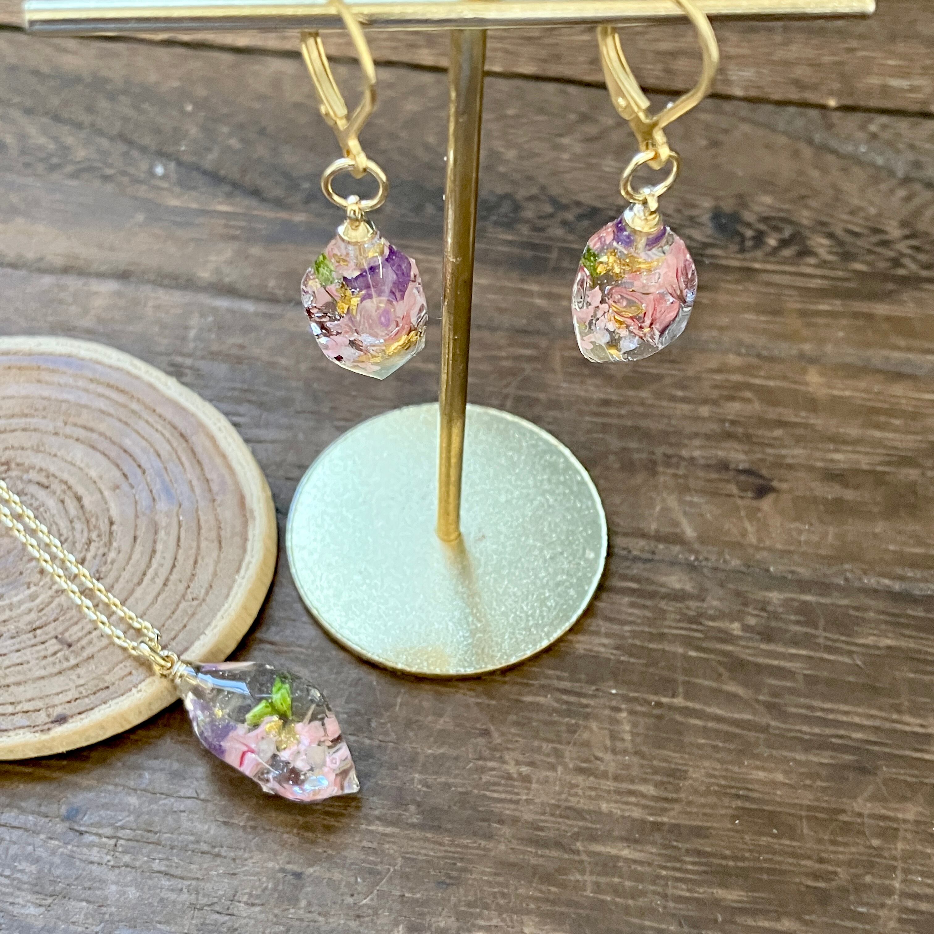 小さな鉱石ピアス&ネックレス 春色花鉱石