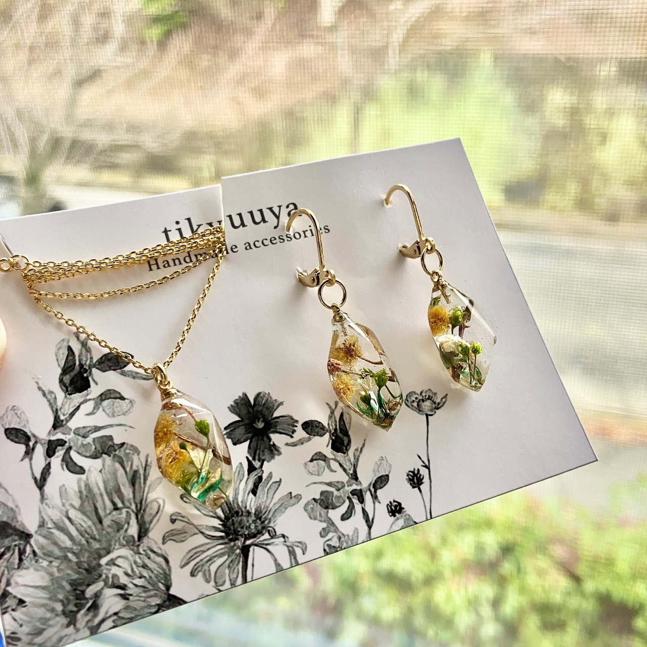 小さな鉱石ピアス&ネックレス ミモザの花鉱石
