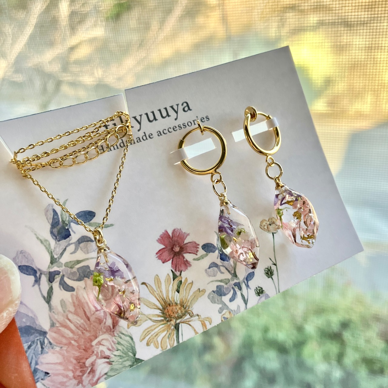 小さな鉱石イヤリング&ネックレス 春色の花鉱石