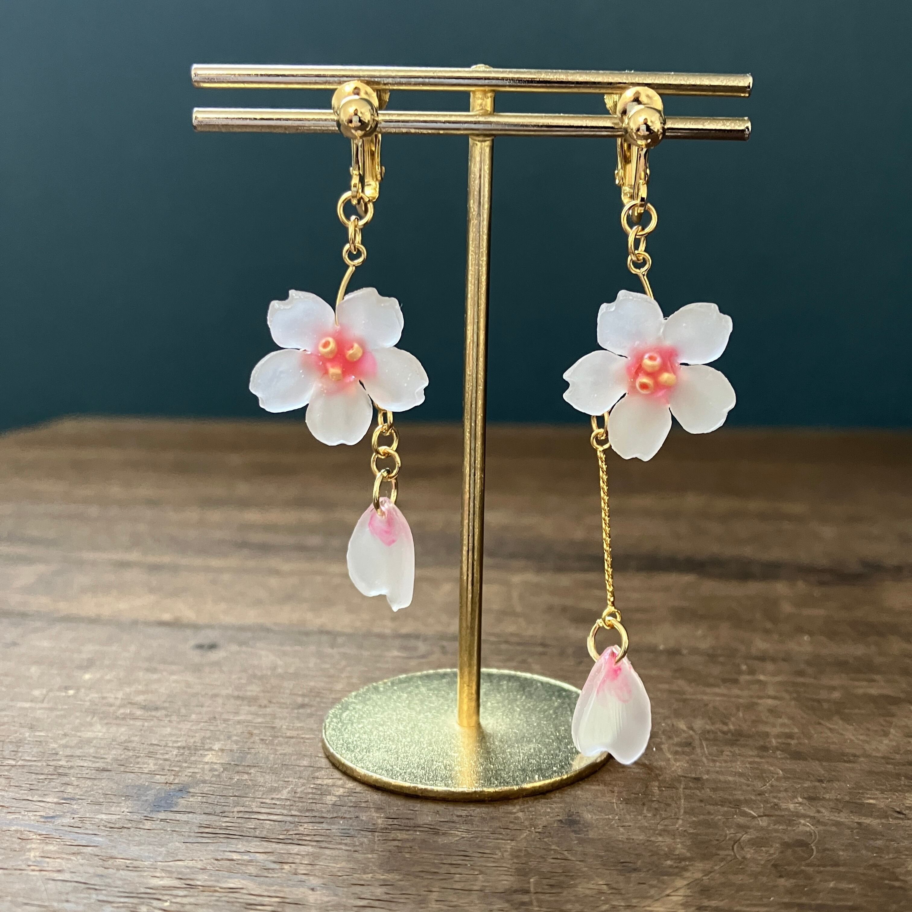 レジンで桜のふんわりとした花とゆらゆら揺れる花びらを作りました。