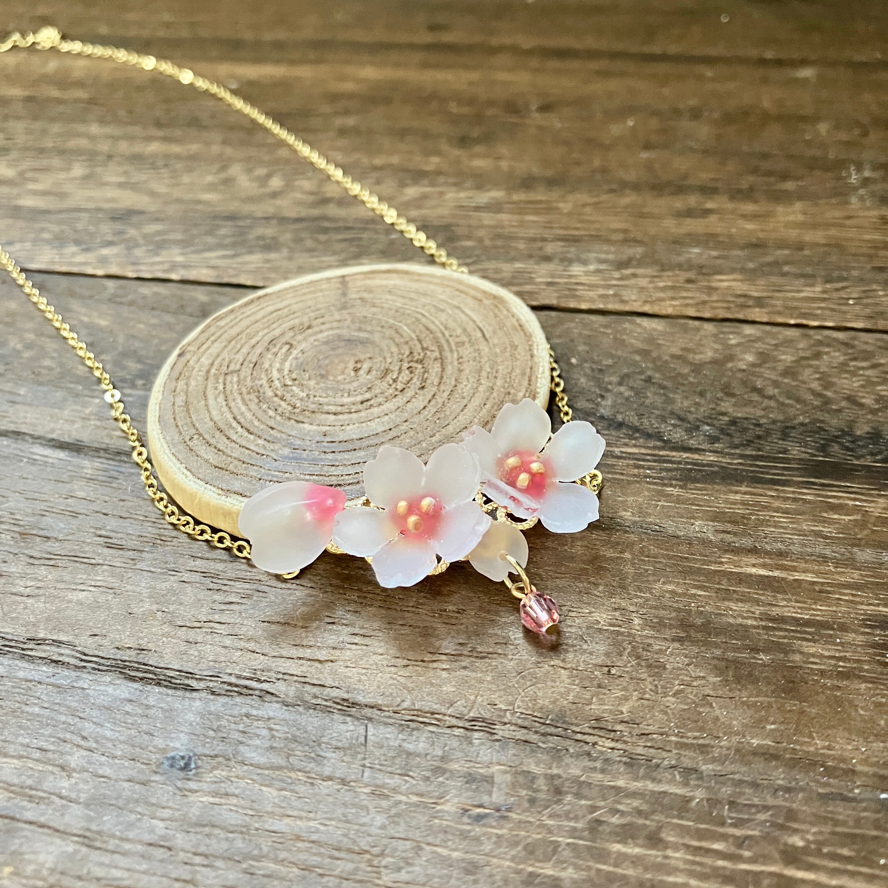 桜のモチーフを重ねて春にぴったりのネックレスに仕立てました。