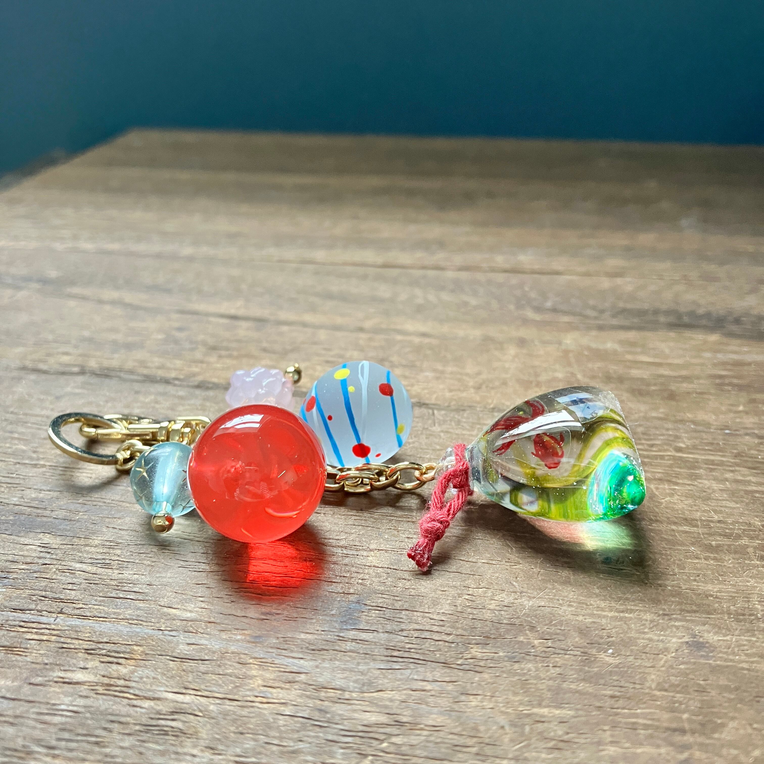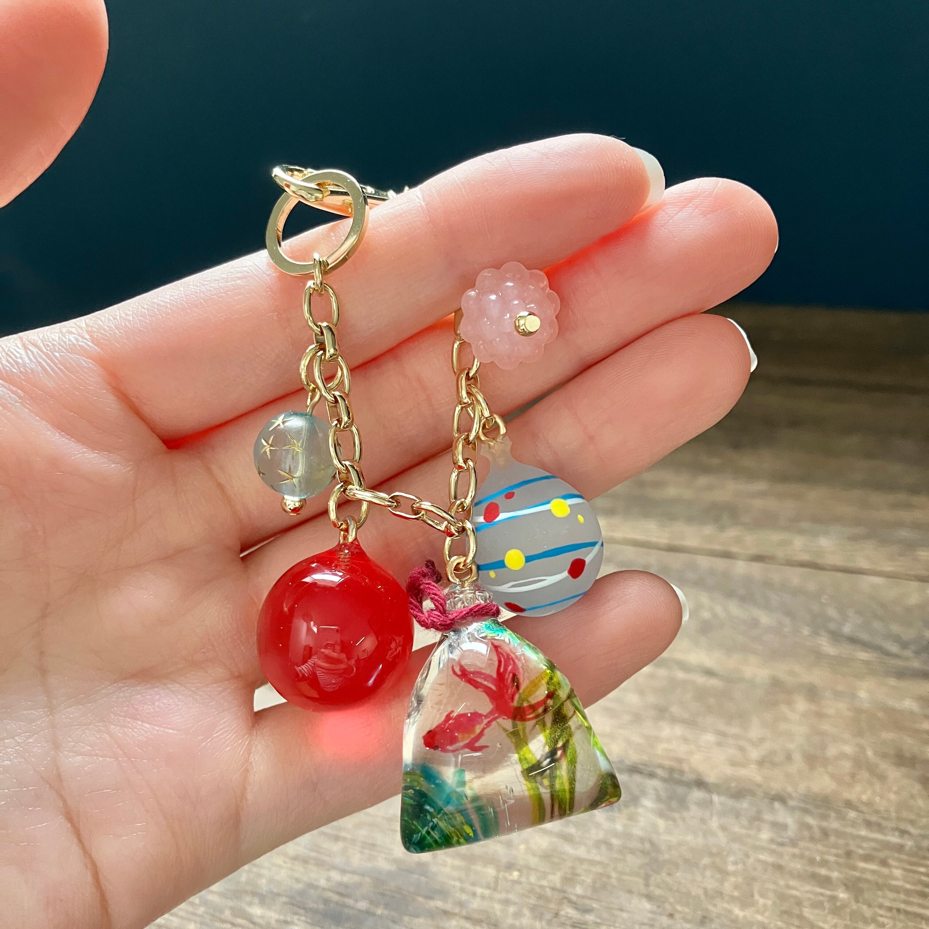 金魚すくい、りんご飴、水風船を組み合わせた夏祭りの雰囲気を楽しめるバックチャームを作りました。