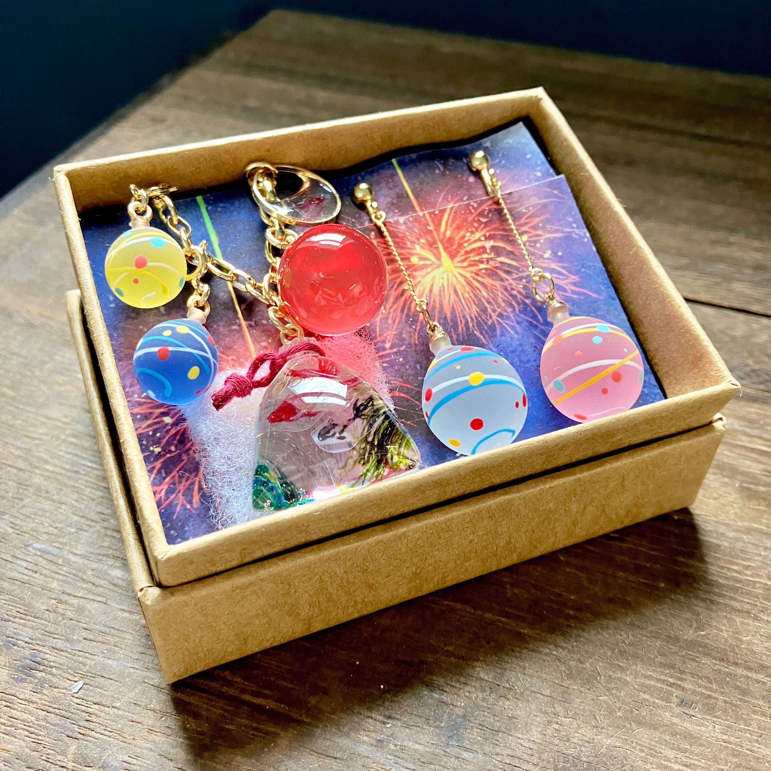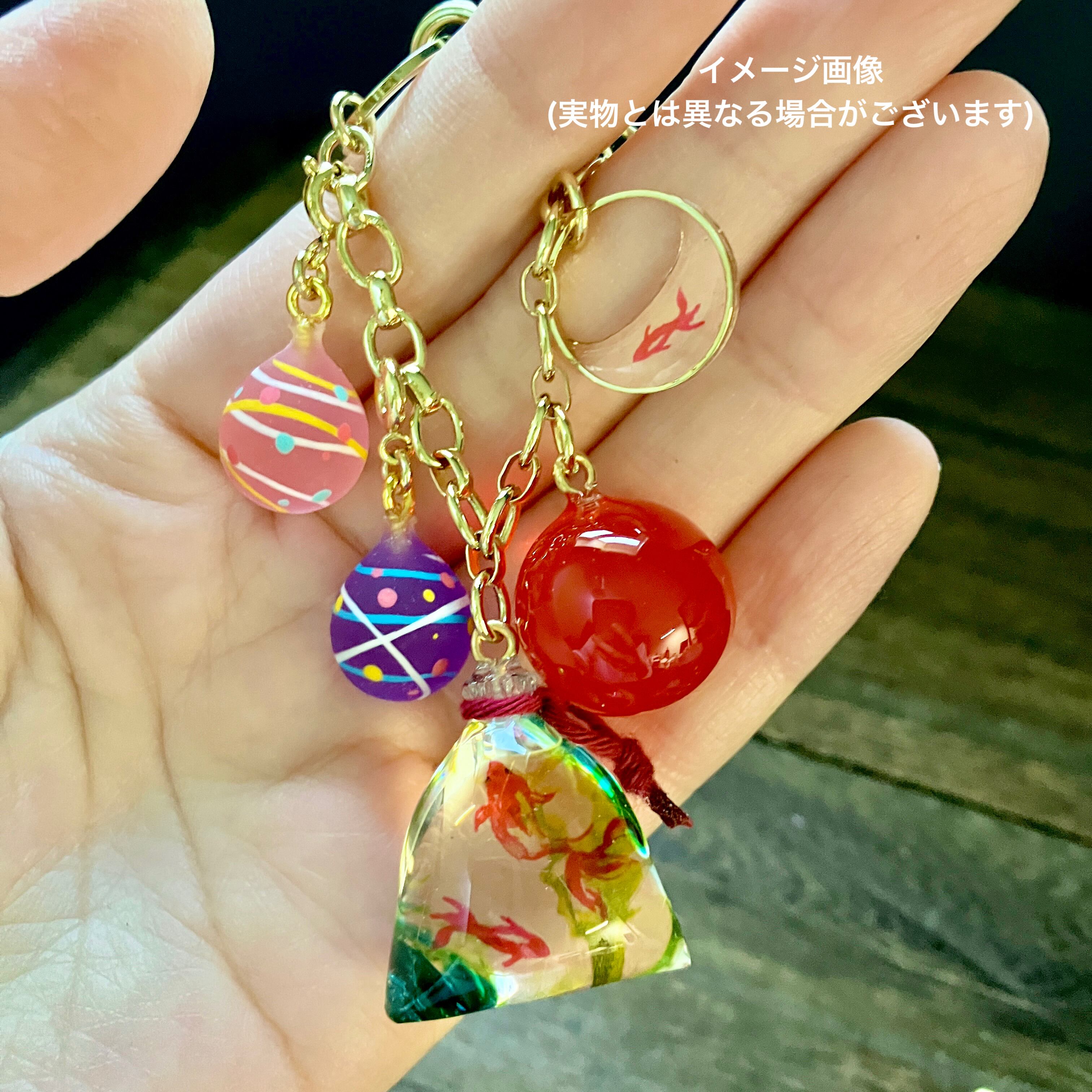 金魚すくい、りんご飴、水風船を組み合わせた夏祭りの雰囲気を楽しめるバックチャームです