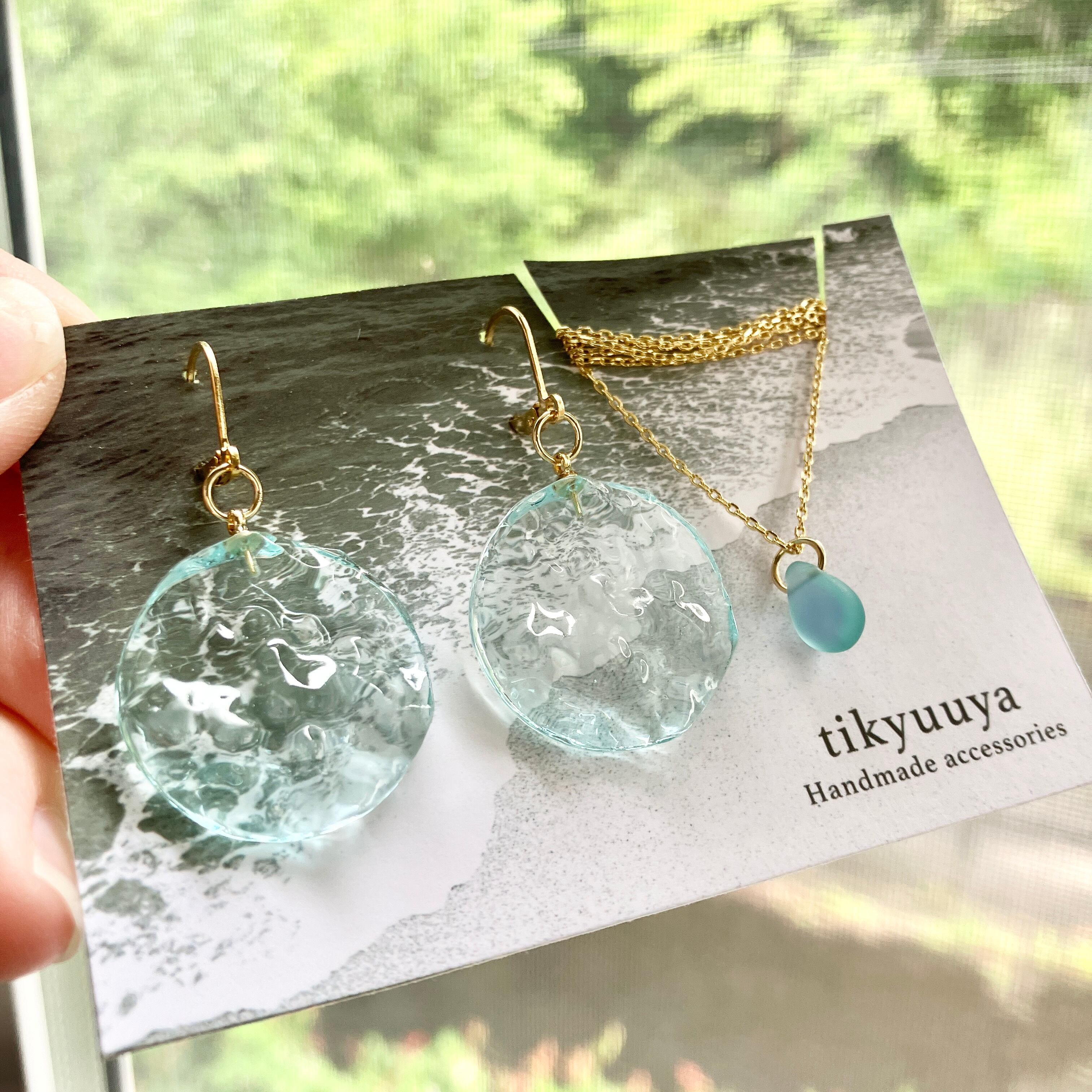 水面ピアス&ブルーグリーンのチェコビーズネックレス