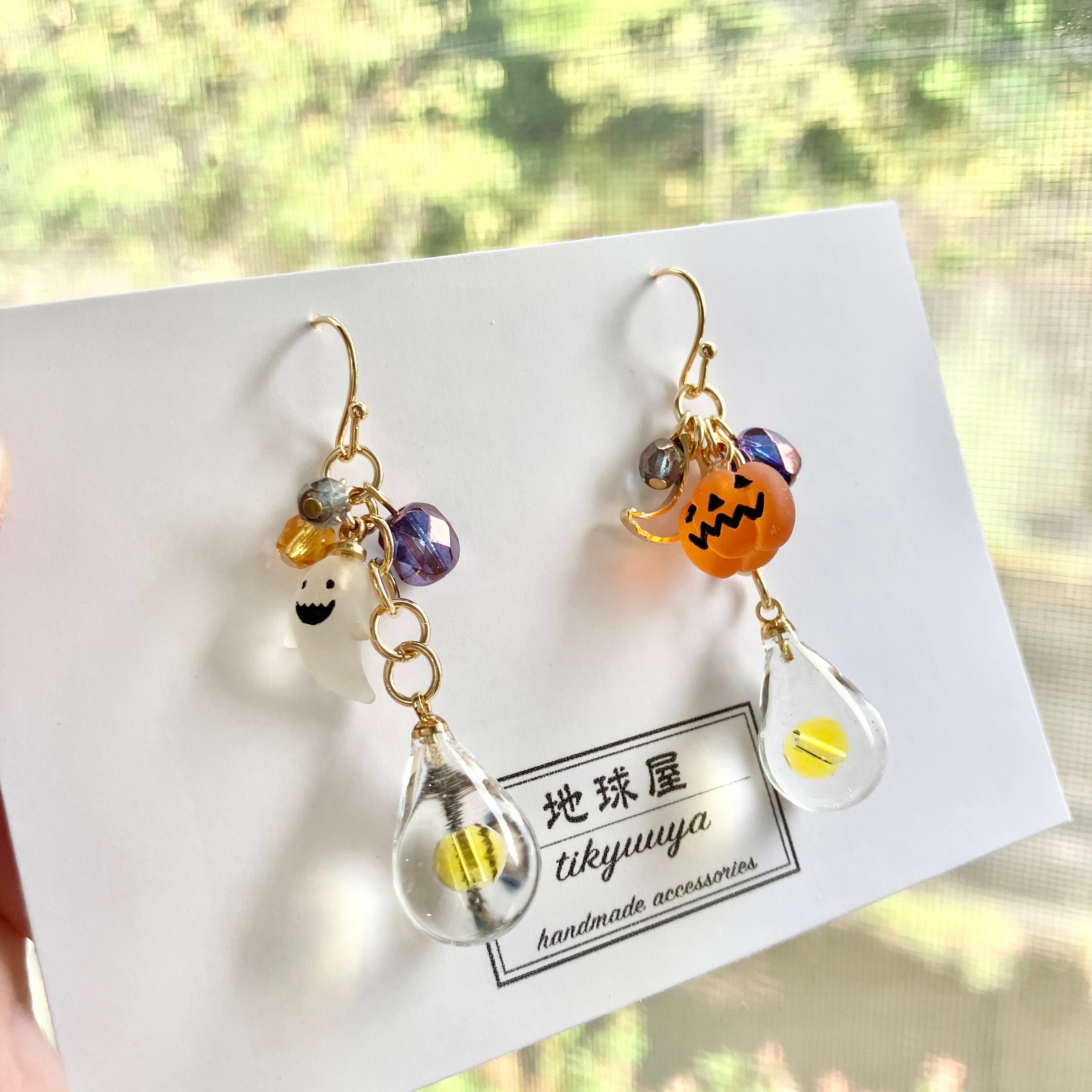 シックな色合いのビーズとオバケ、ジャックオランタンがゆらゆら揺れる存在感のある耳飾りです。