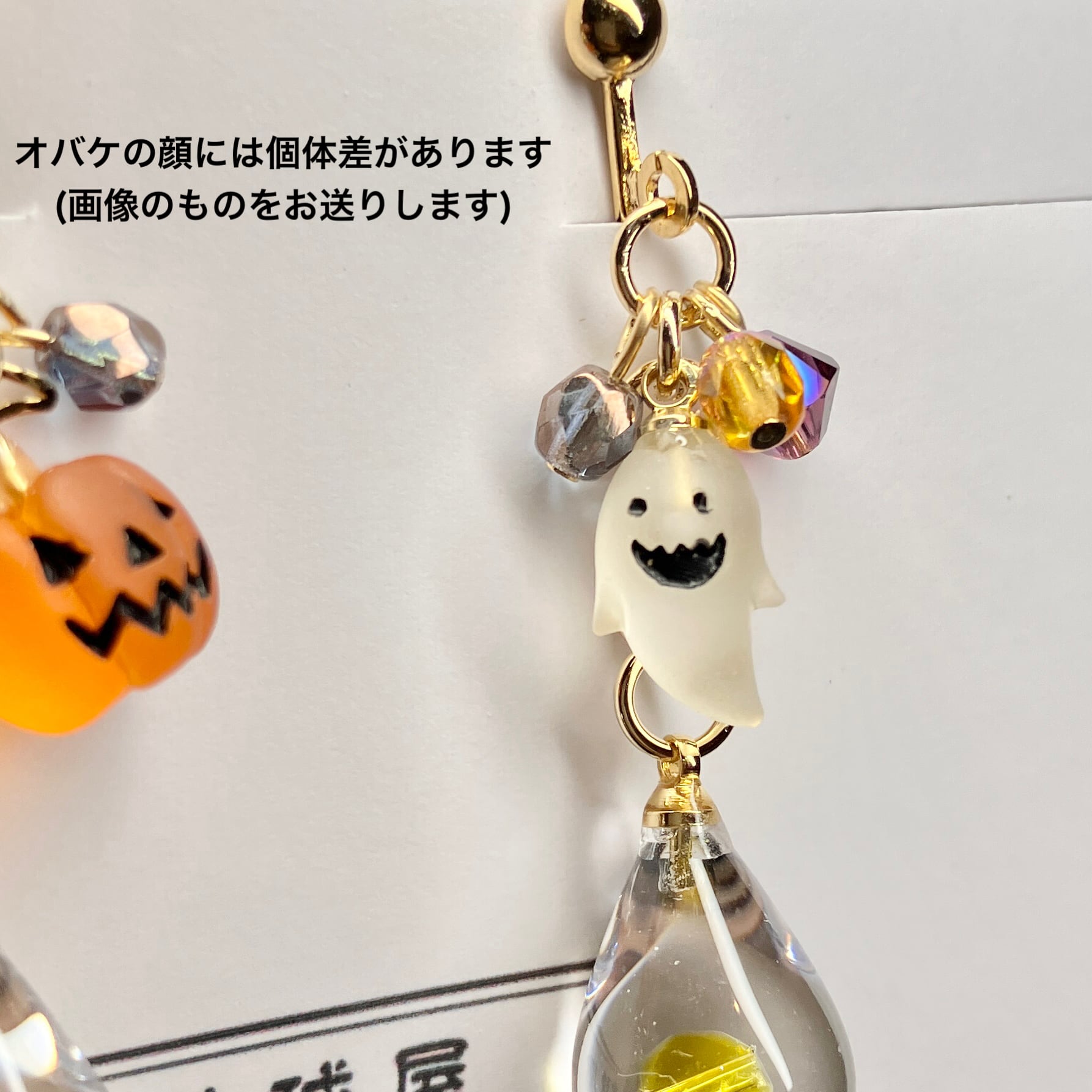 シックな色合いのビーズとオバケ、ジャックオランタンがゆらゆら揺れる存在感のある耳飾りです。