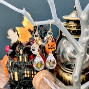シックな色合いのビーズとオバケ、ジャックオランタンがゆらゆら揺れる存在感のある耳飾りです。