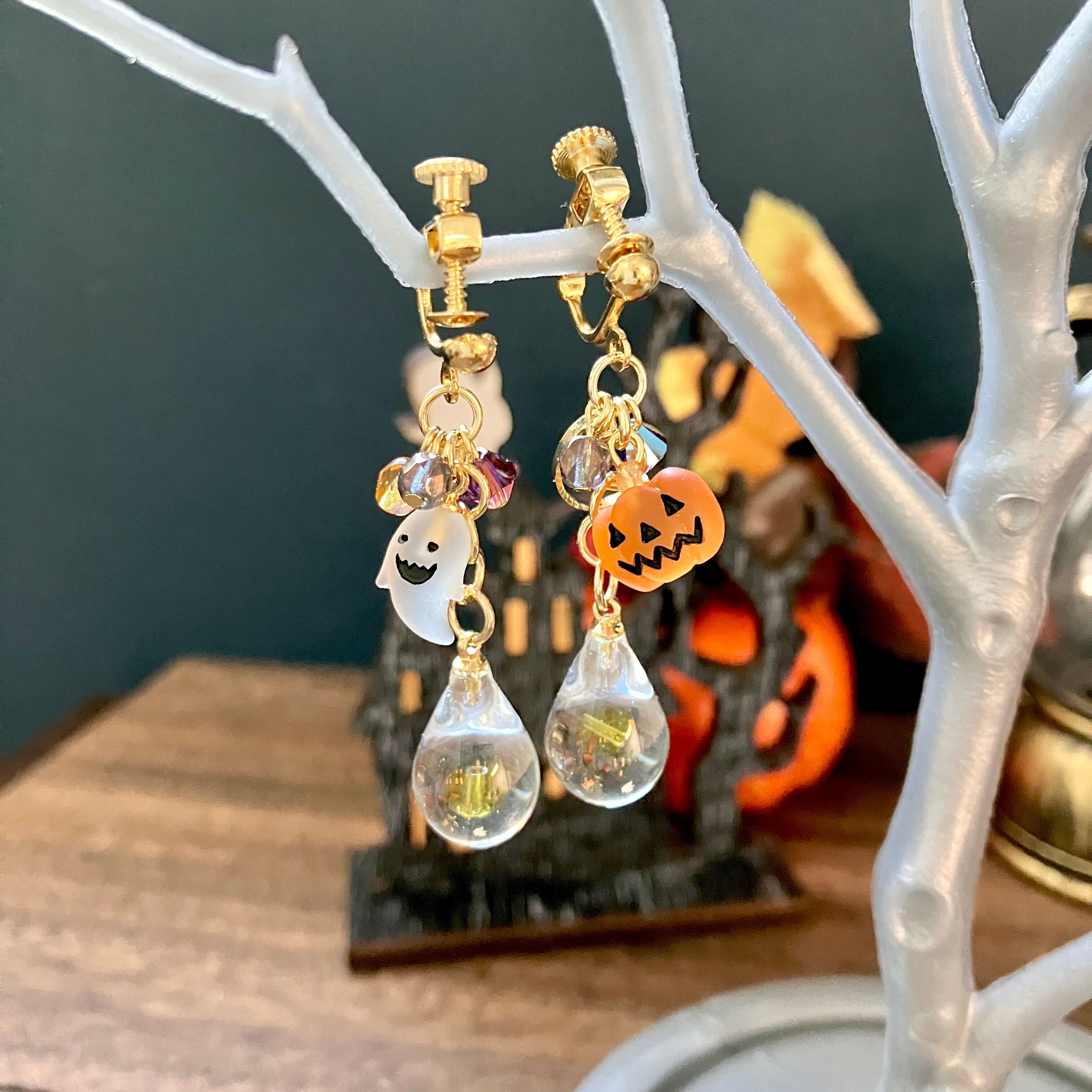 シックな色合いのビーズとオバケ、ジャックオランタンがゆらゆら揺れる存在感のある耳飾りです。