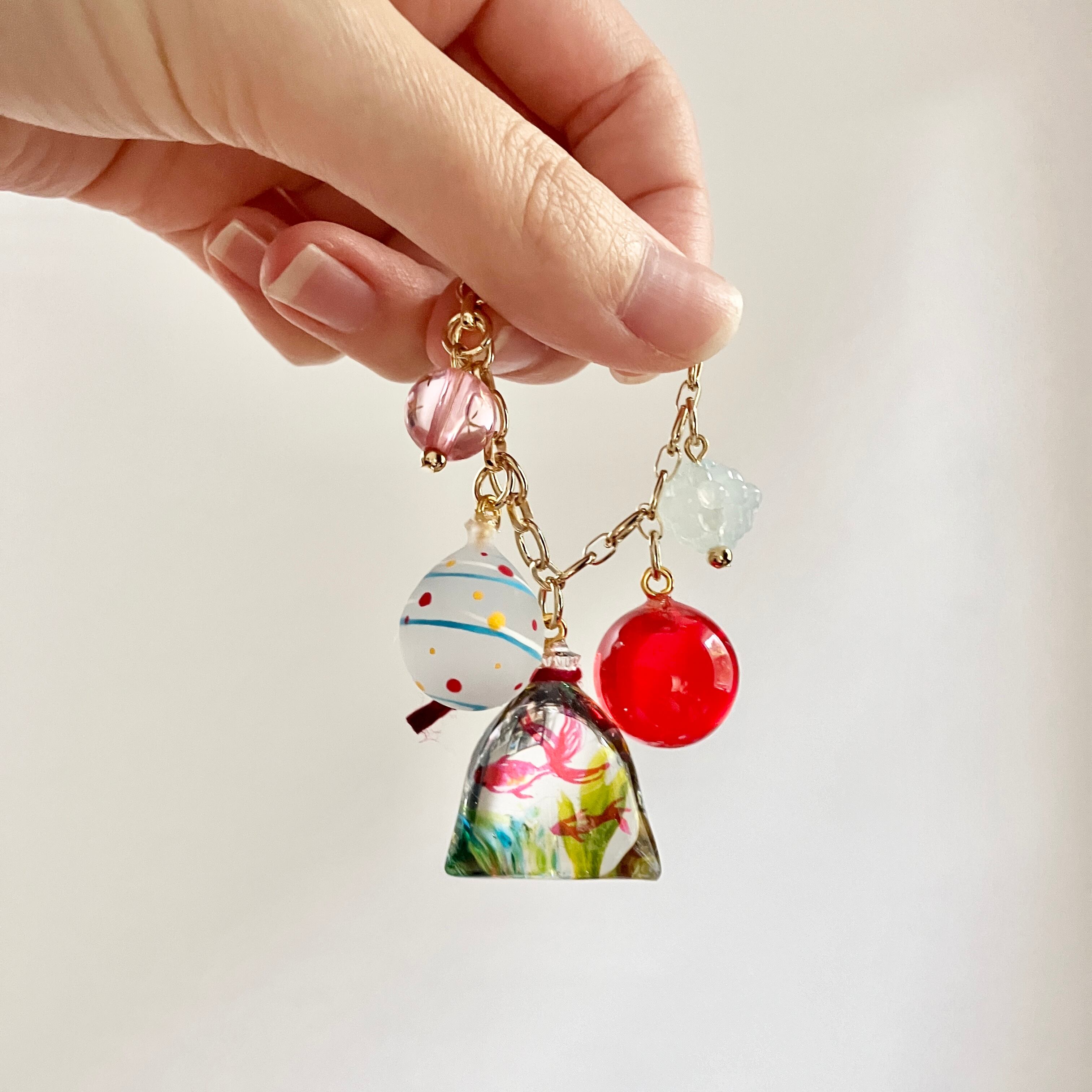 金魚すくい、りんご飴、水風船を組み合わせた夏祭りの雰囲気を楽しめるバックチャームを作りました。