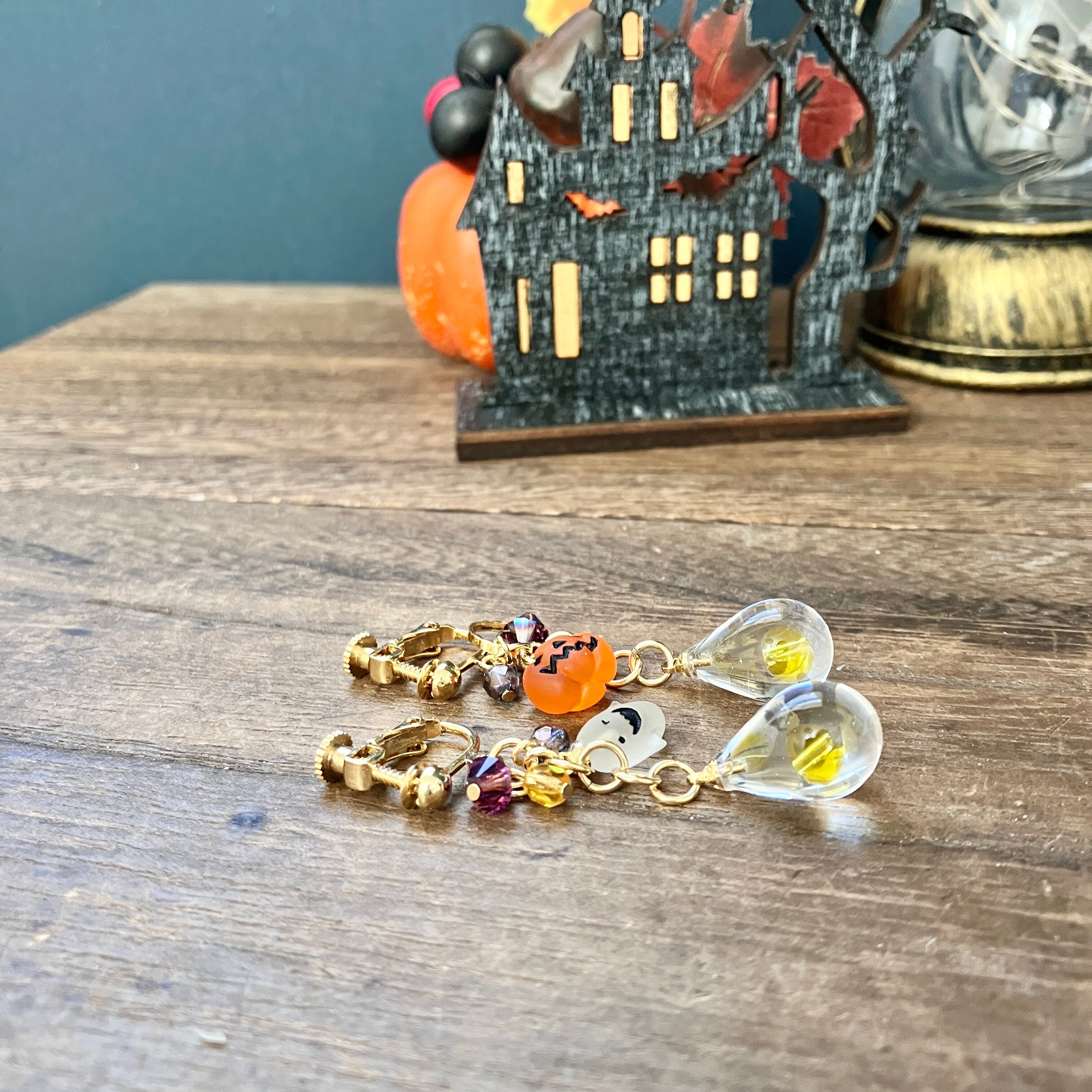 シックな色合いのビーズとオバケ、ジャックオランタンがゆらゆら揺れる存在感のある耳飾りです。