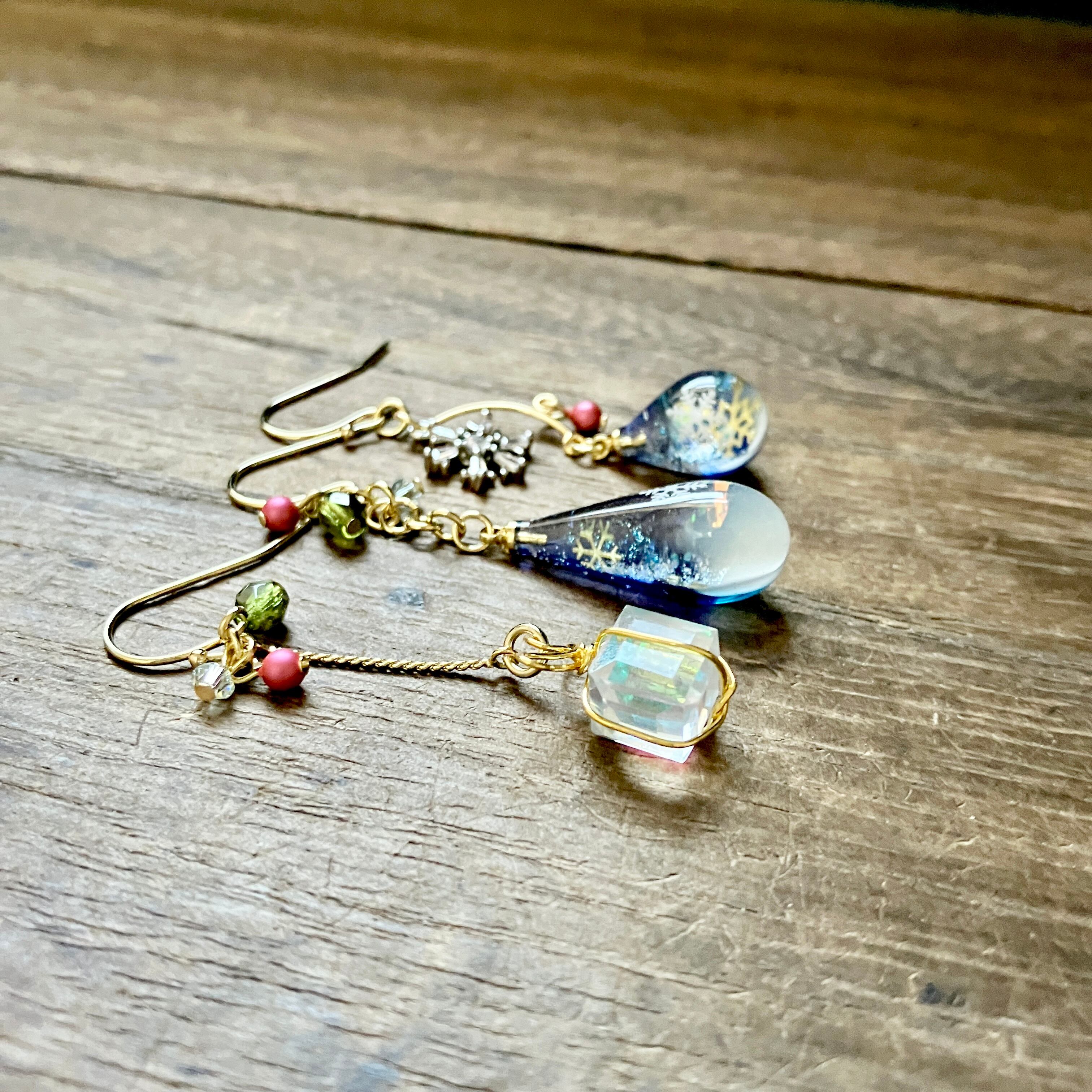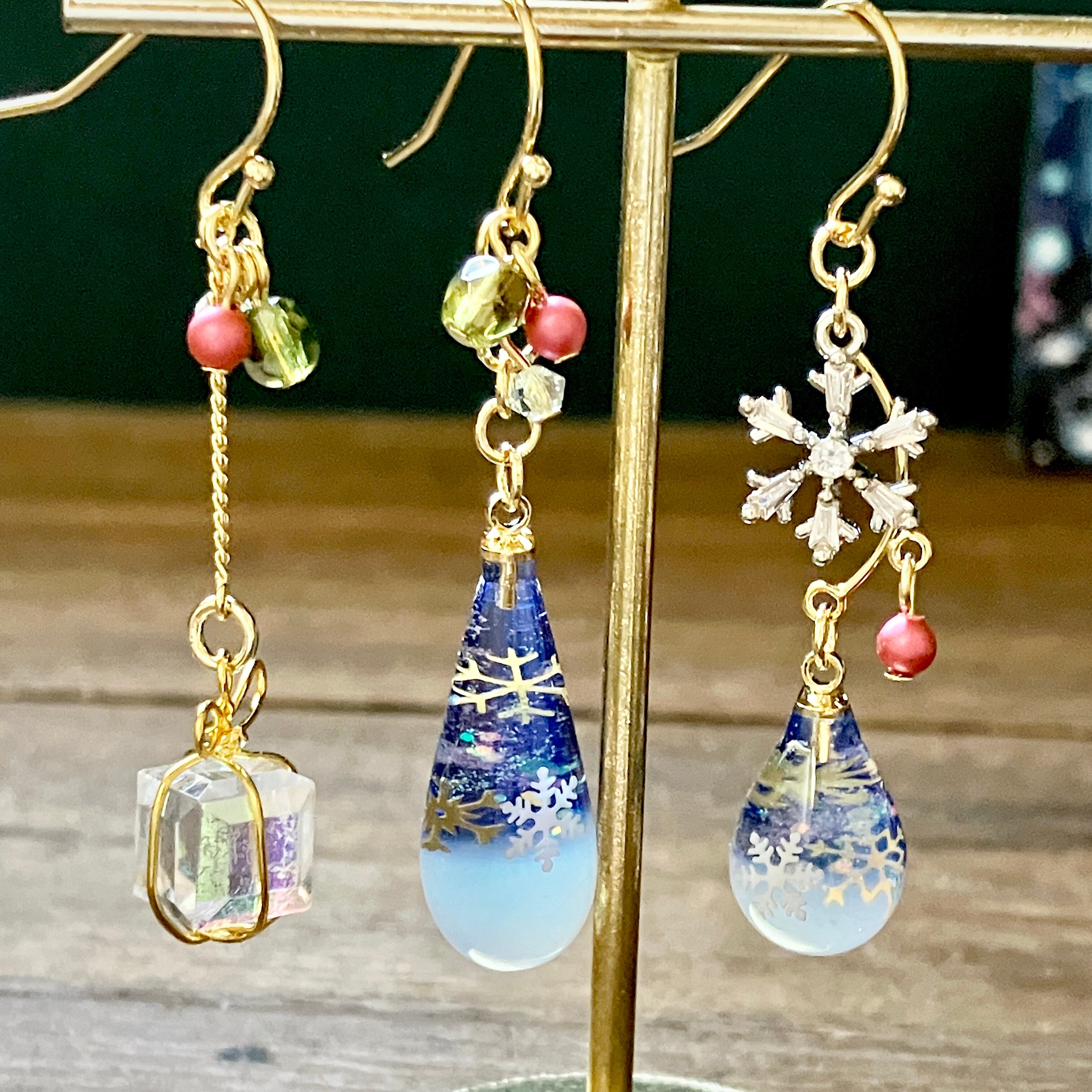 スワロフスキーもワンポイントに取り付けて、冬限定の耳飾りに仕上げました。