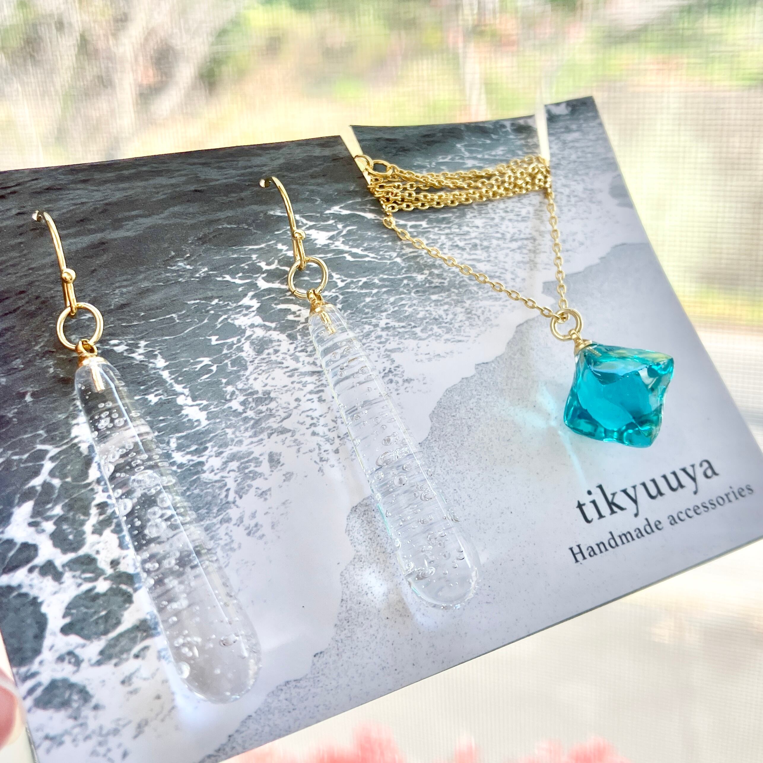 少し訳ありドロップピアスと鉱石ネックレス 海のかけら