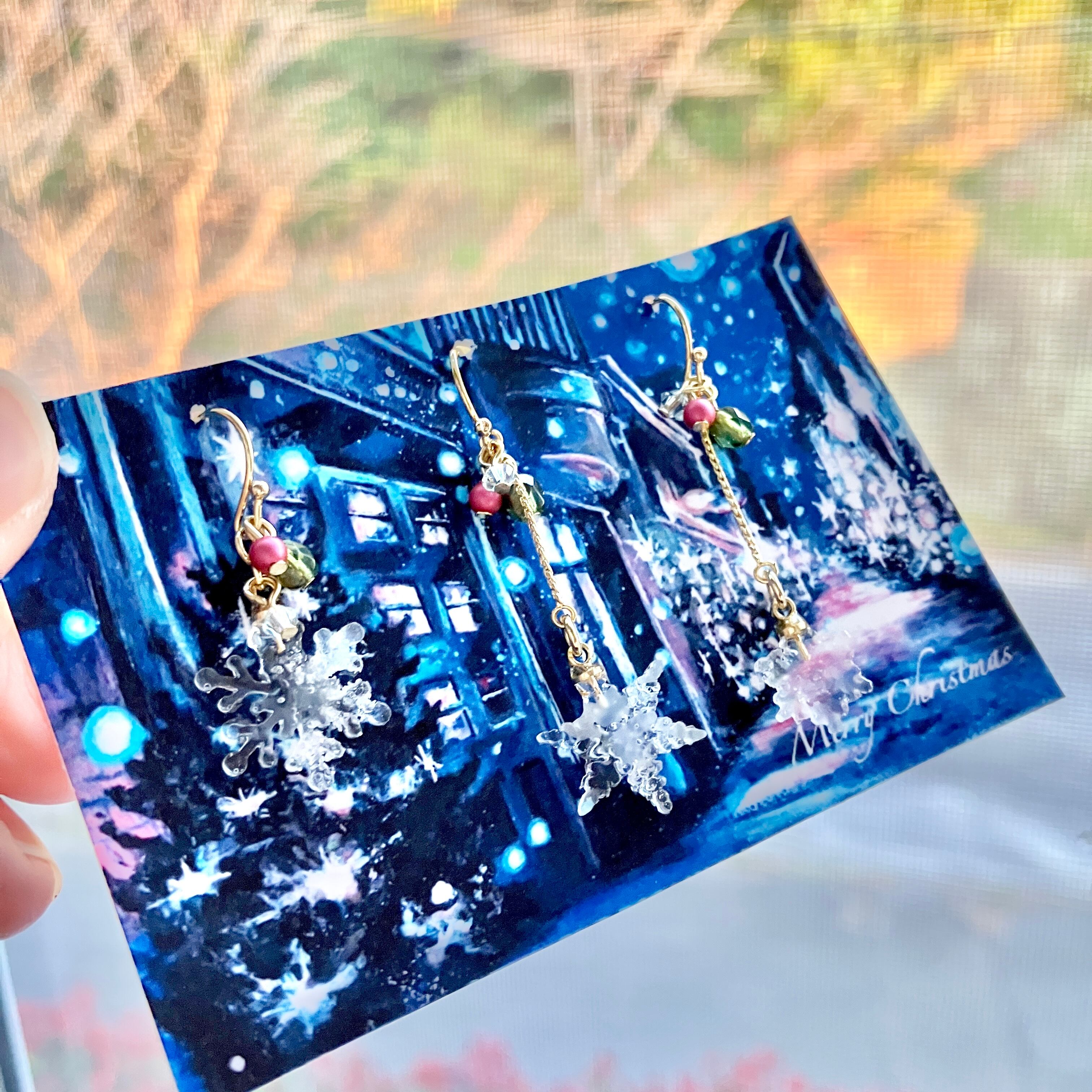 オーナメントカラーのスワロフスキーもワンポイントに取り付けて、冬限定の耳飾りに仕上げました。