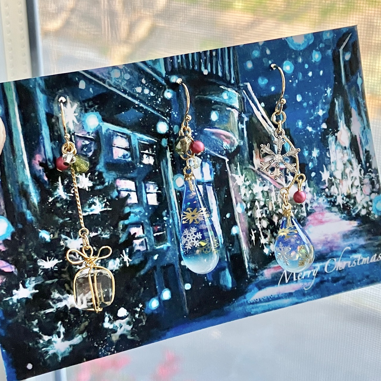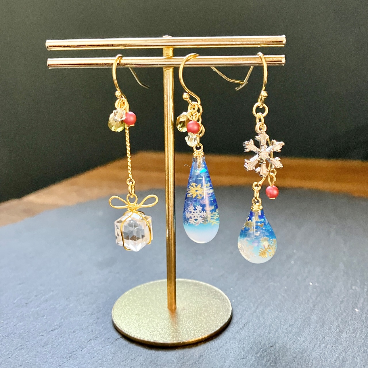 スワロフスキーもワンポイントに取り付けて、冬限定の耳飾りに仕上げました。