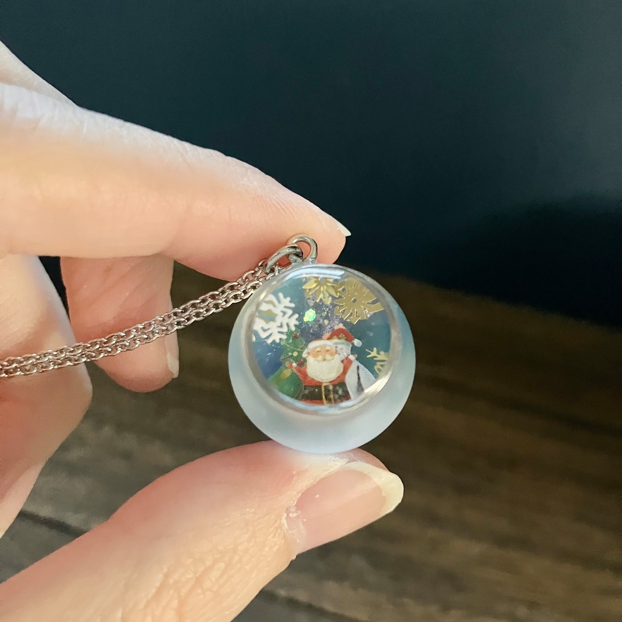 球体のトップにスノードームのようなキラキラの世界を閉じ込めました。