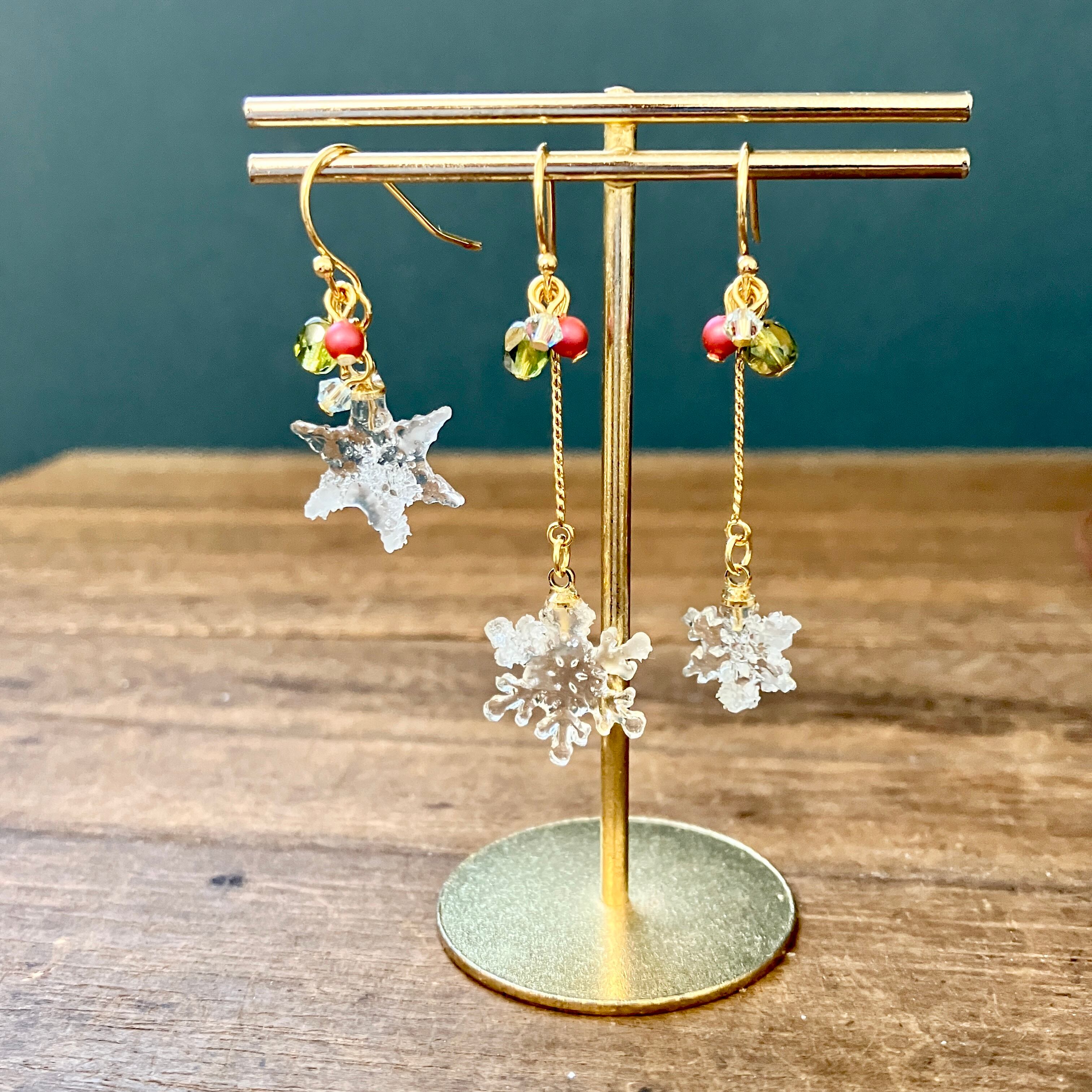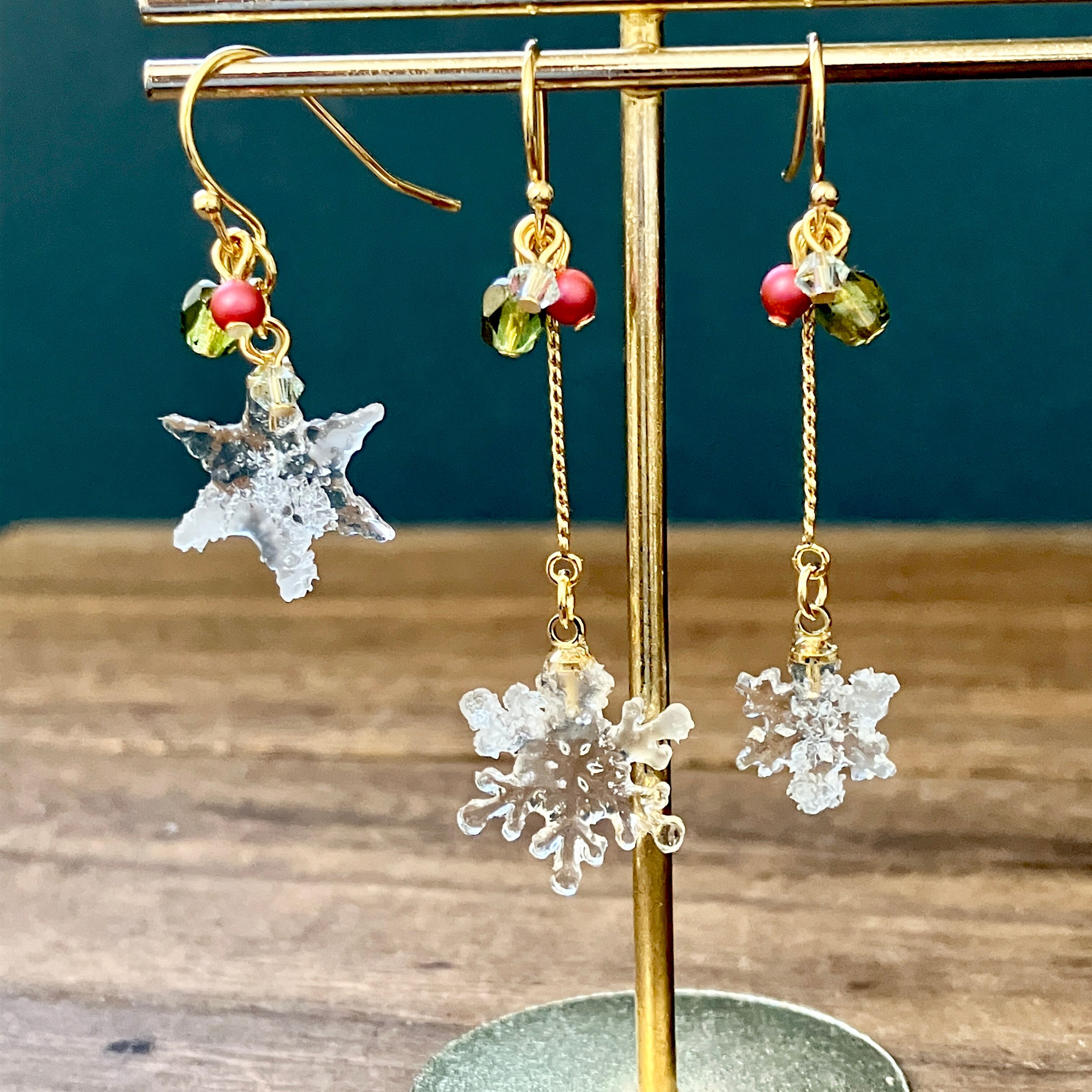 オーナメントカラーのスワロフスキーもワンポイントに取り付けて、冬限定の耳飾りに仕上げました。