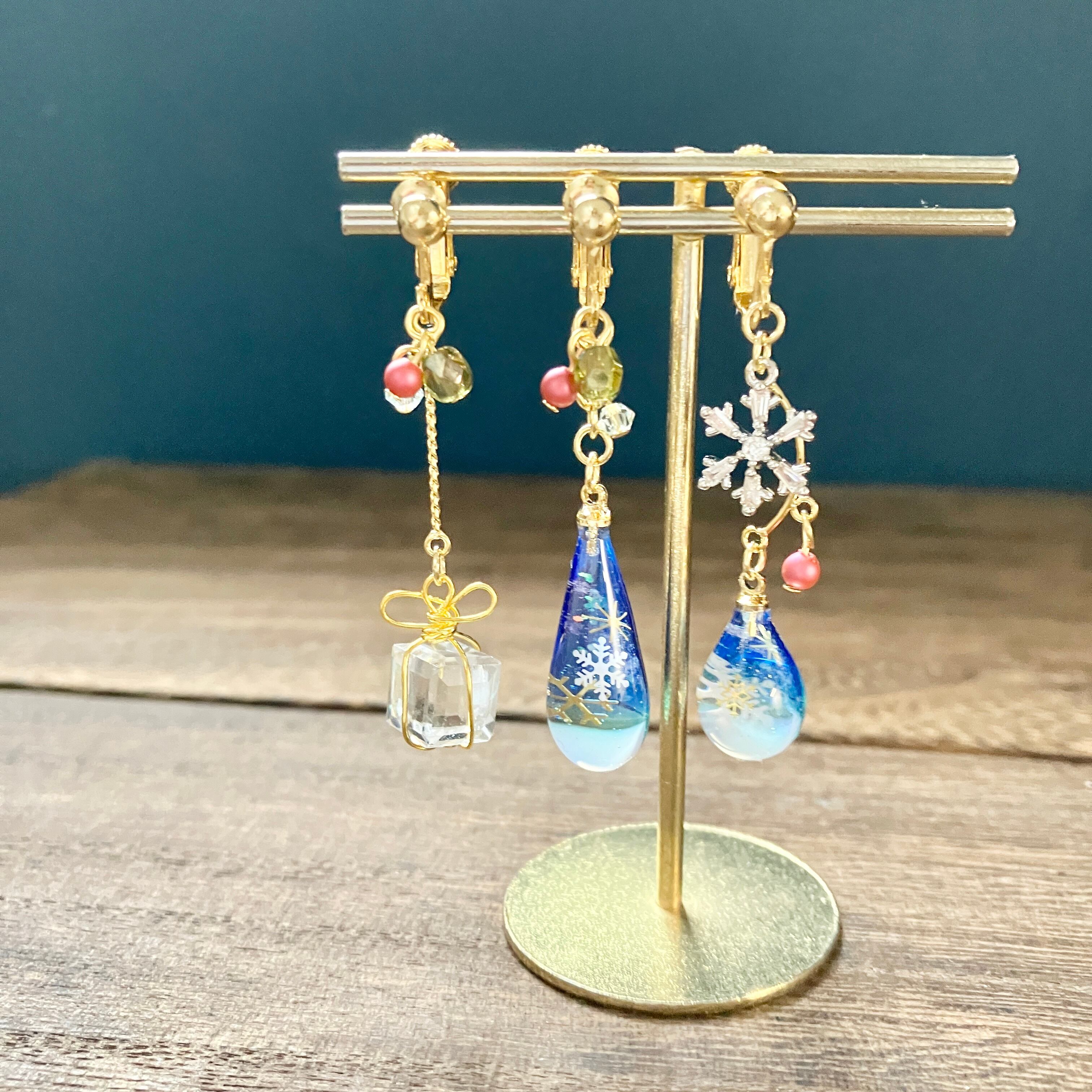 スワロフスキーもワンポイントに取り付けて、冬限定の耳飾りに仕上げました。