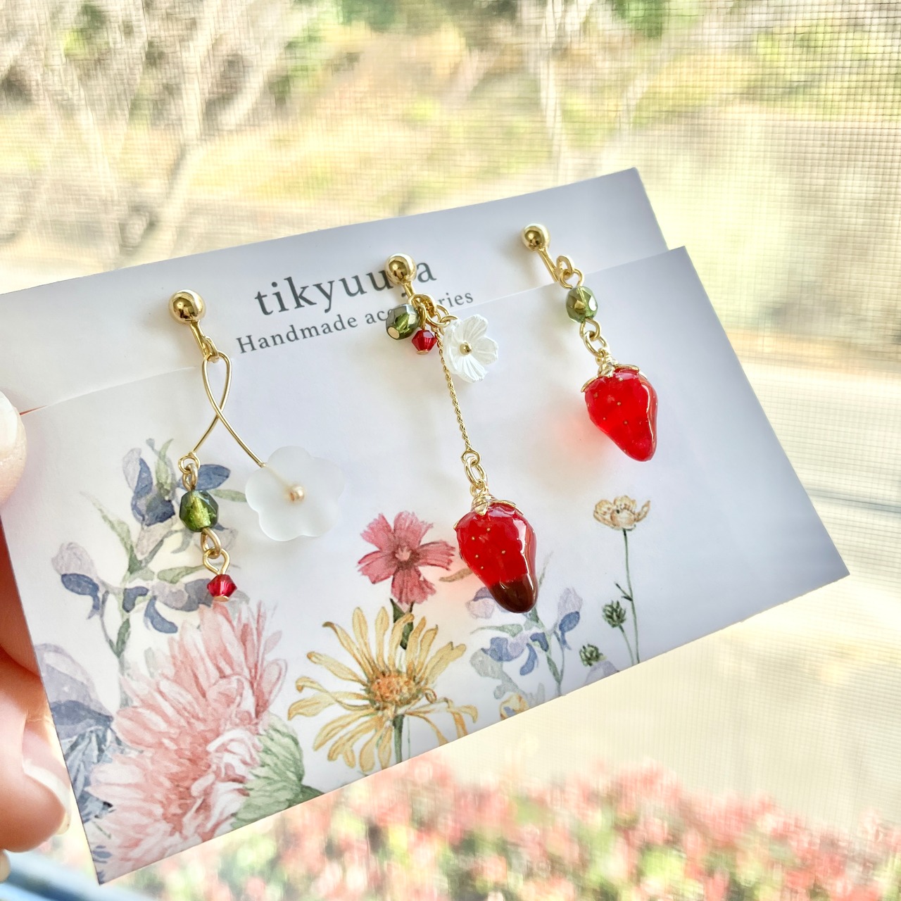 まっ赤な苺とチョコ付きの苺、そして苺の花をイメージしたモチーフの3個セットです!