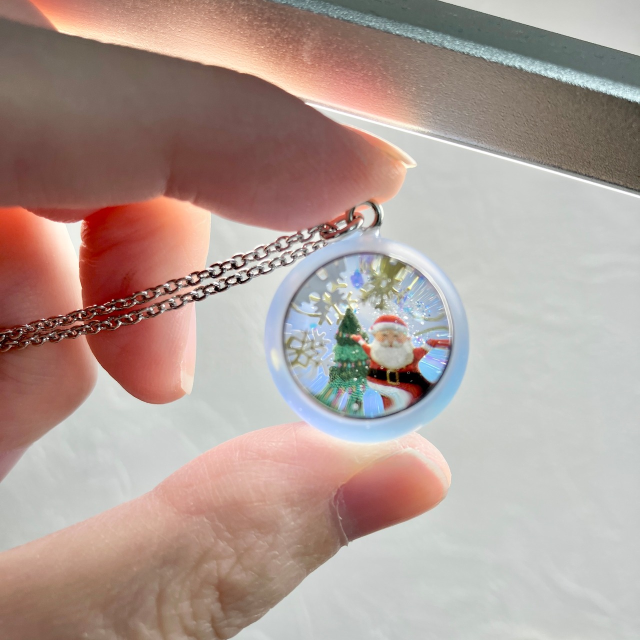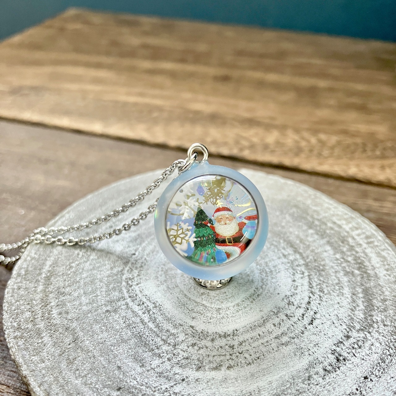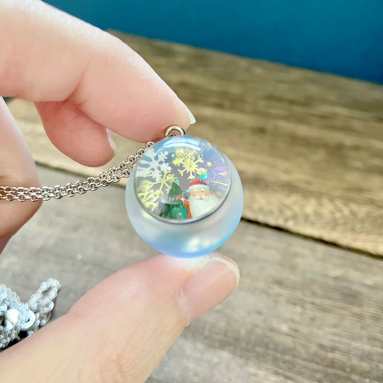 球体のトップにスノードームのようなキラキラの世界を閉じ込めました。