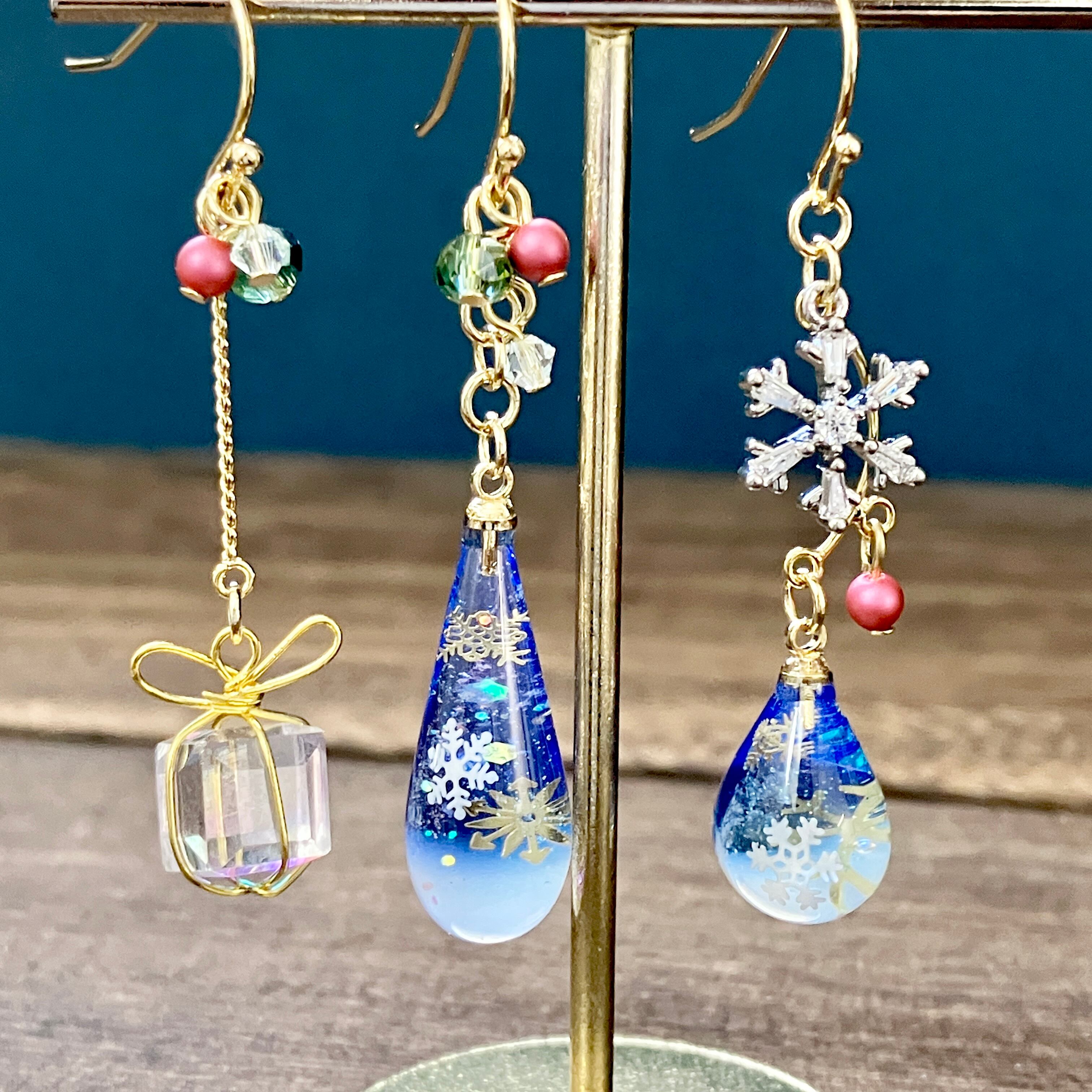 スワロフスキーもワンポイントに取り付けて、冬限定の耳飾りに仕上げました。