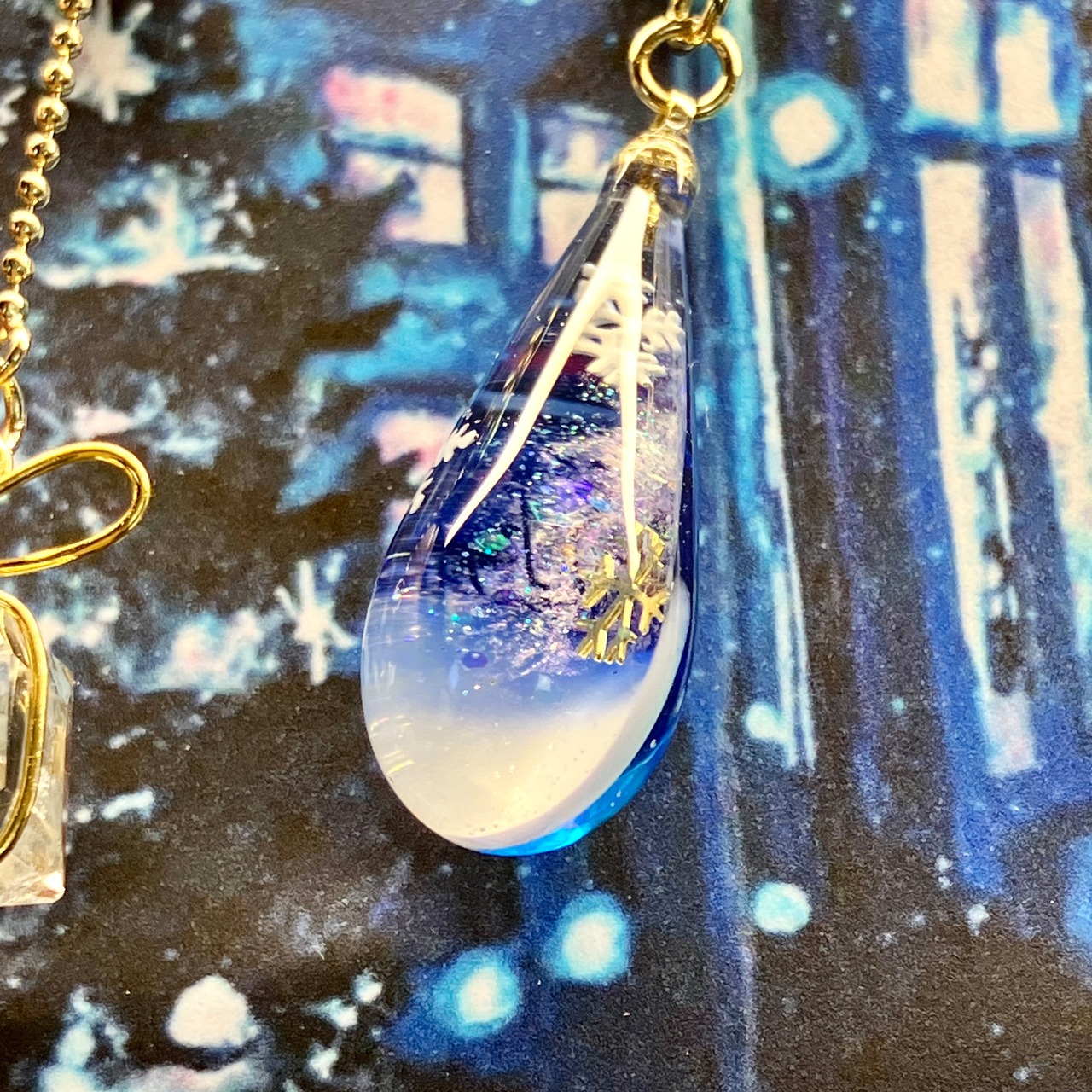 雫型のトップにスノードームのようにキラキラと雪が舞う景色を閉じ込めました。