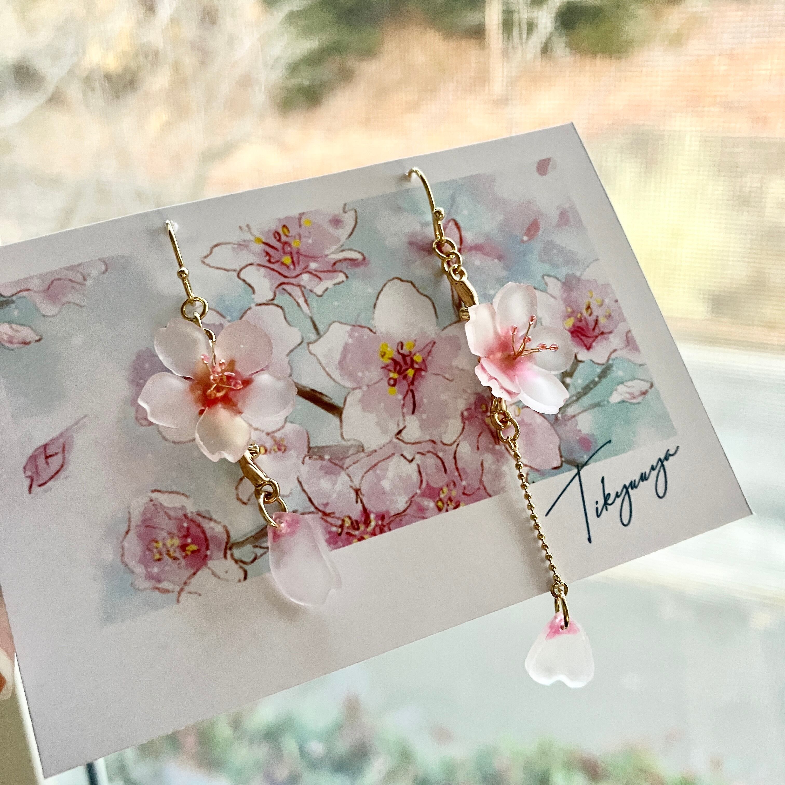 レジンで桜のふんわりとした花とゆらゆら揺れる花びらを作りました。