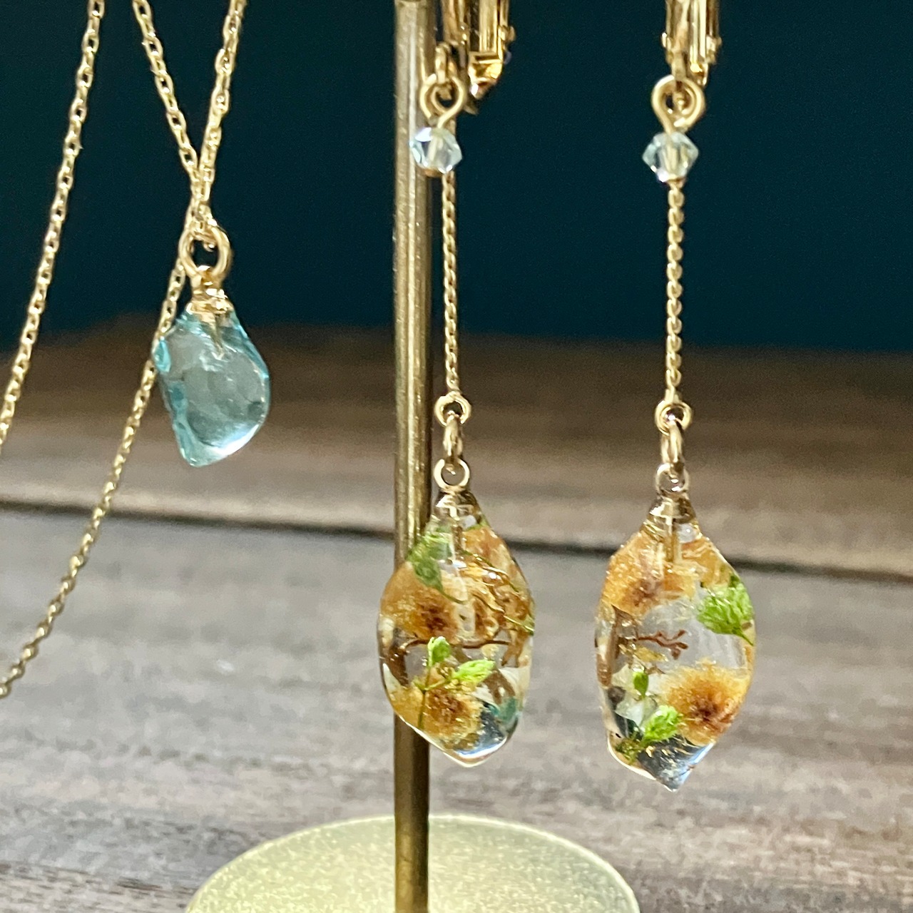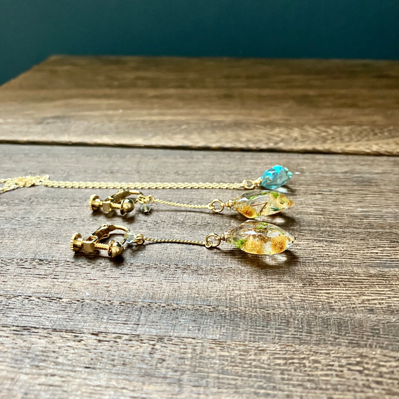 ゆらゆら小さな鉱石イヤリング&ネックレス ミモザの花鉱石
