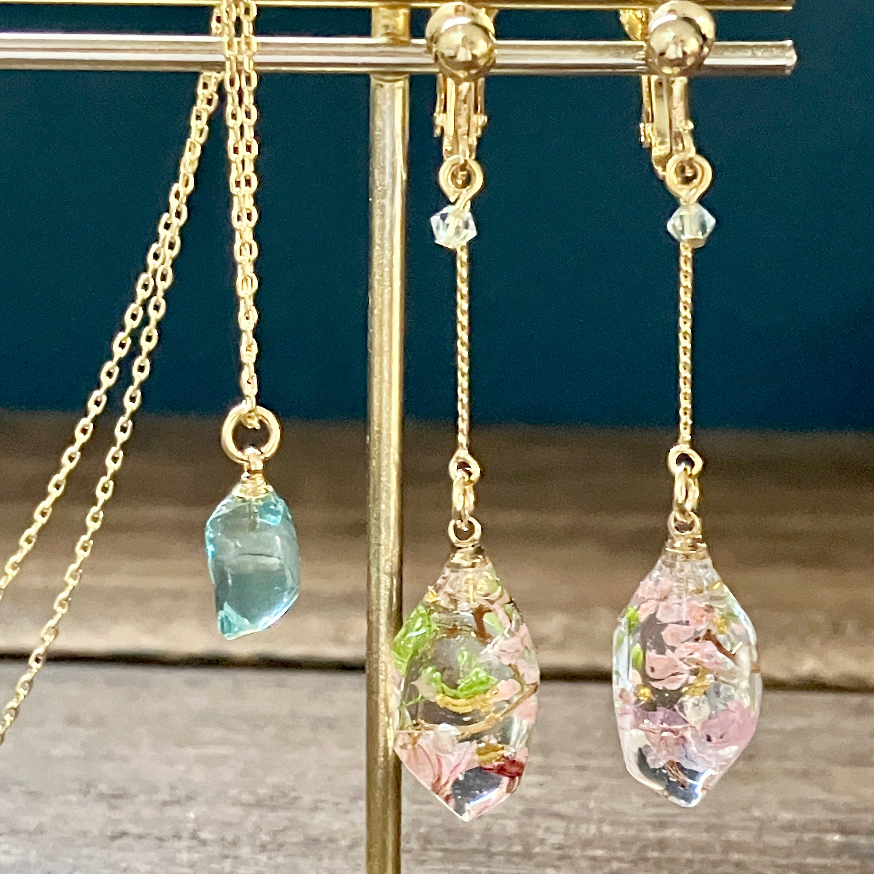 ゆらゆら小さな鉱石イヤリング&ネックレス 春色の花鉱石