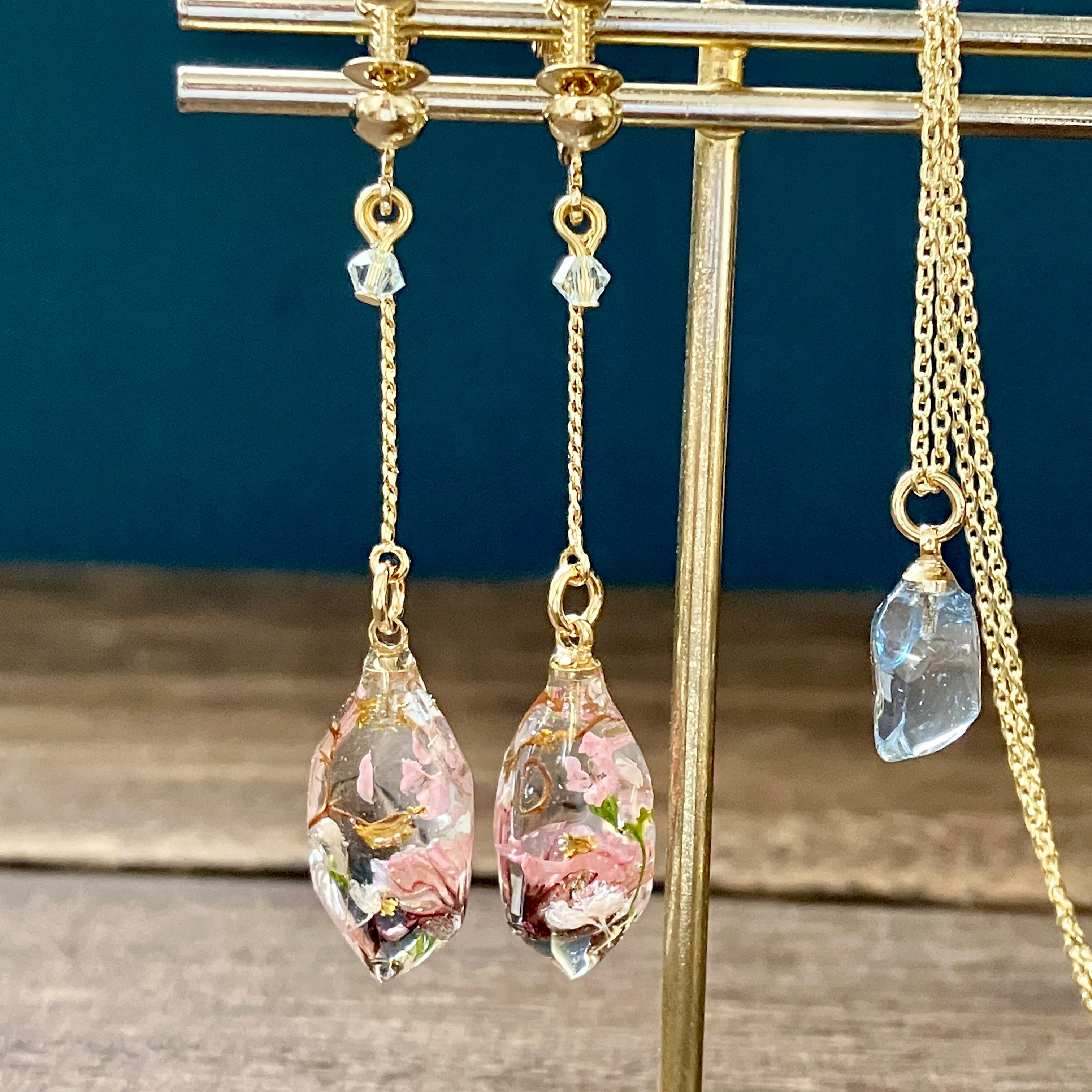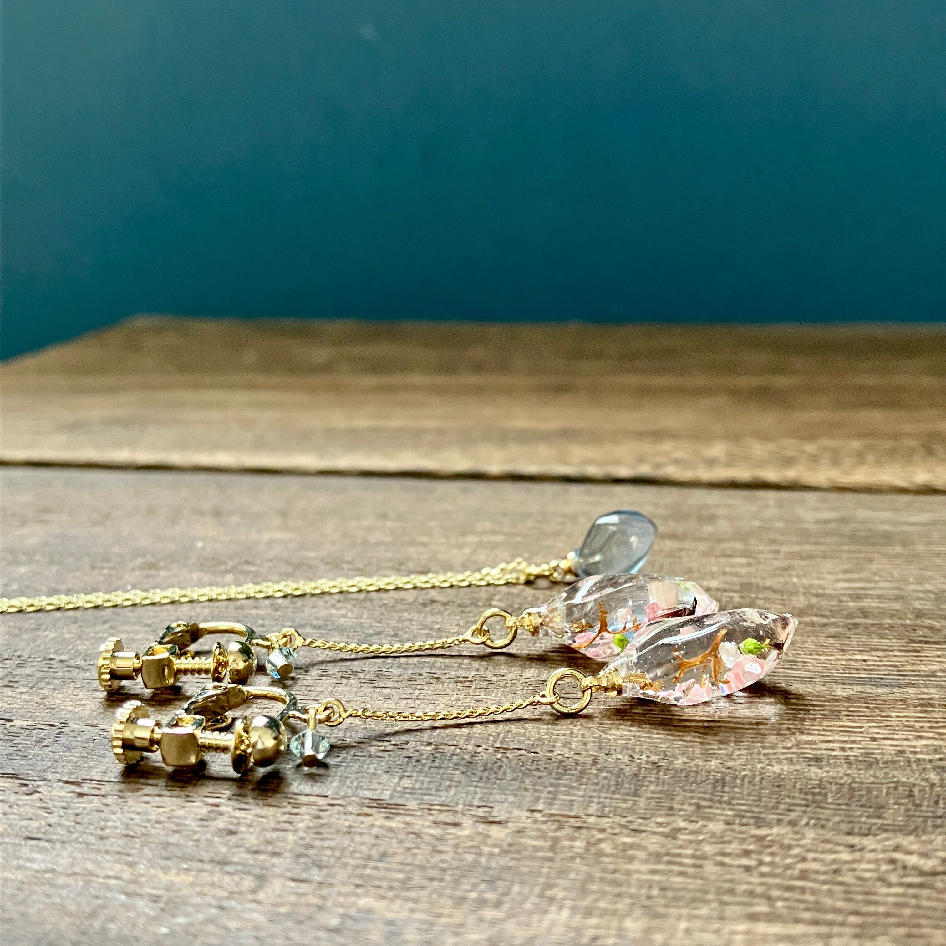 ゆらゆら小さな鉱石イヤリング&ネックレス 春色の花鉱石