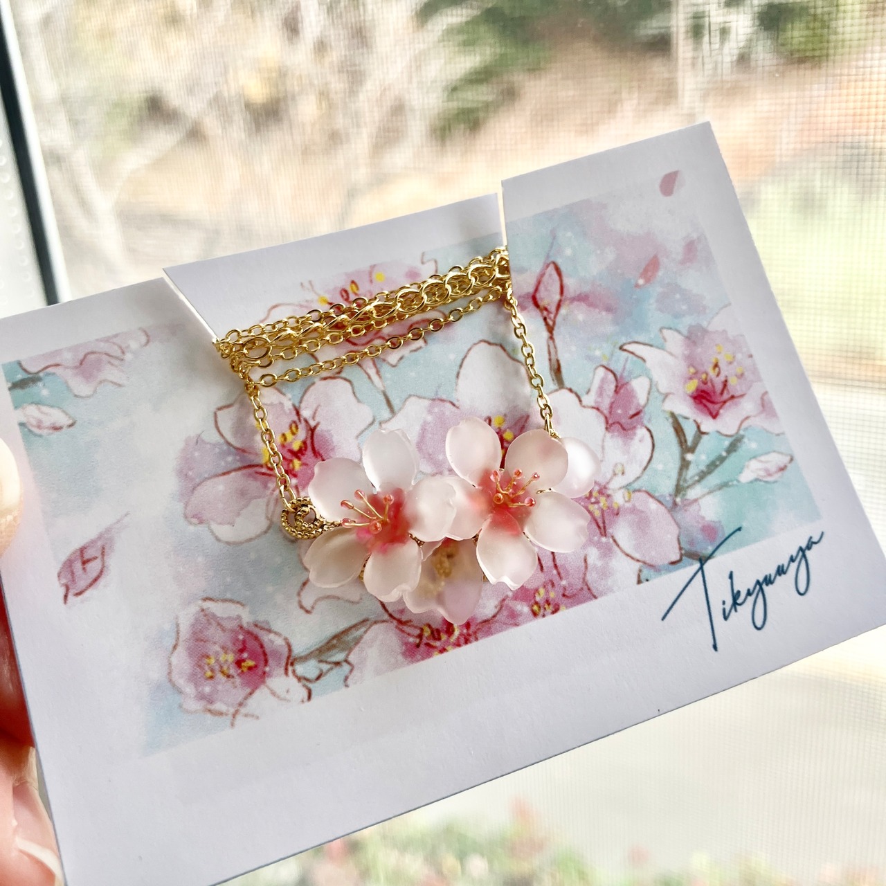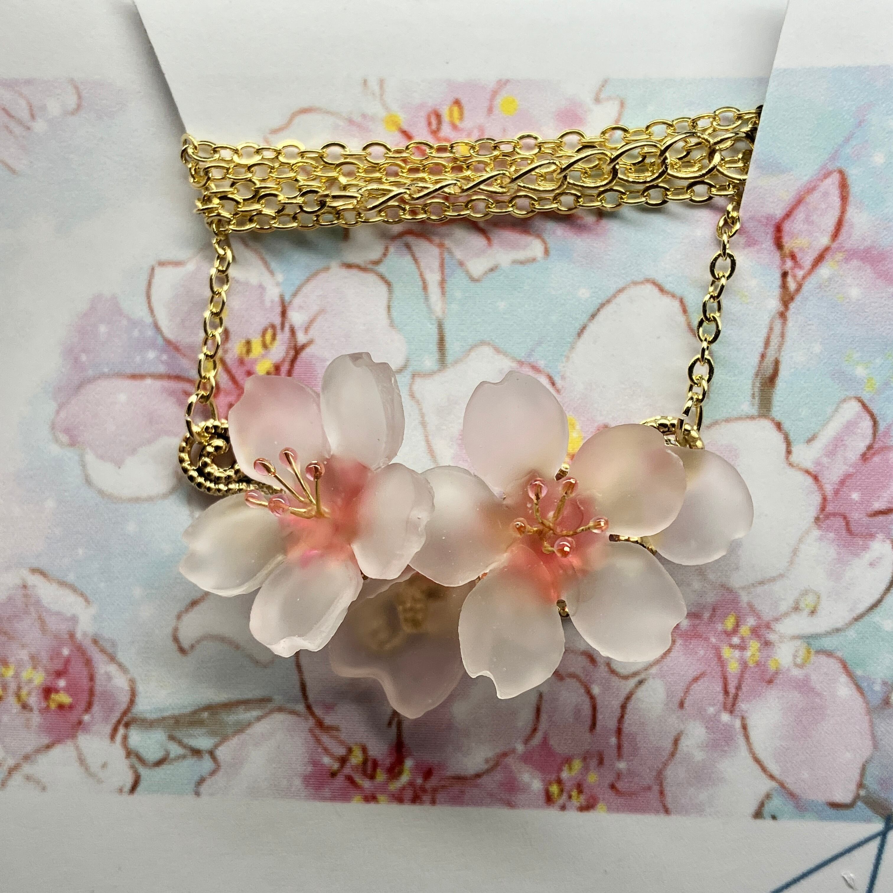桜のモチーフを重ねて春にぴったりのネックレスに仕立てました。