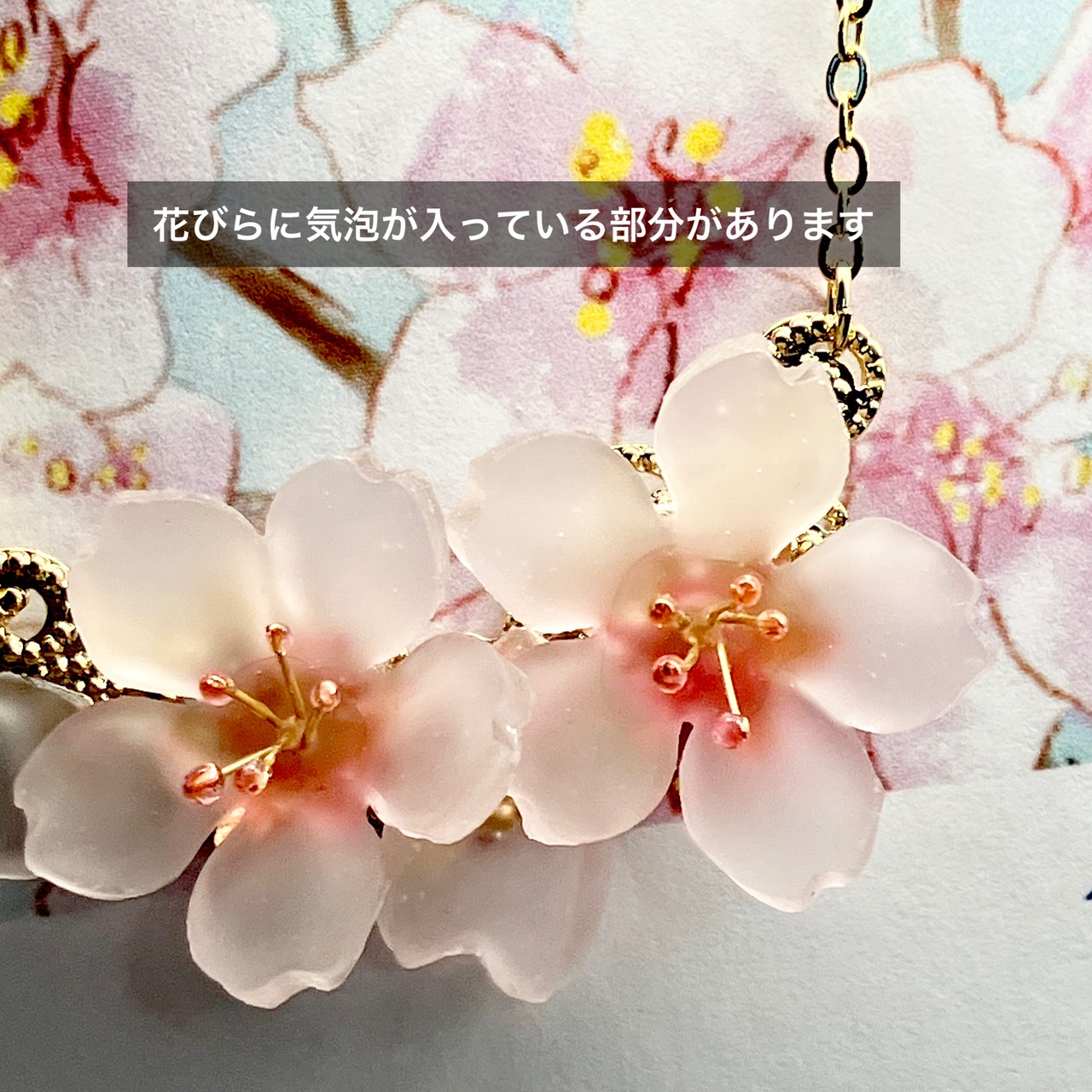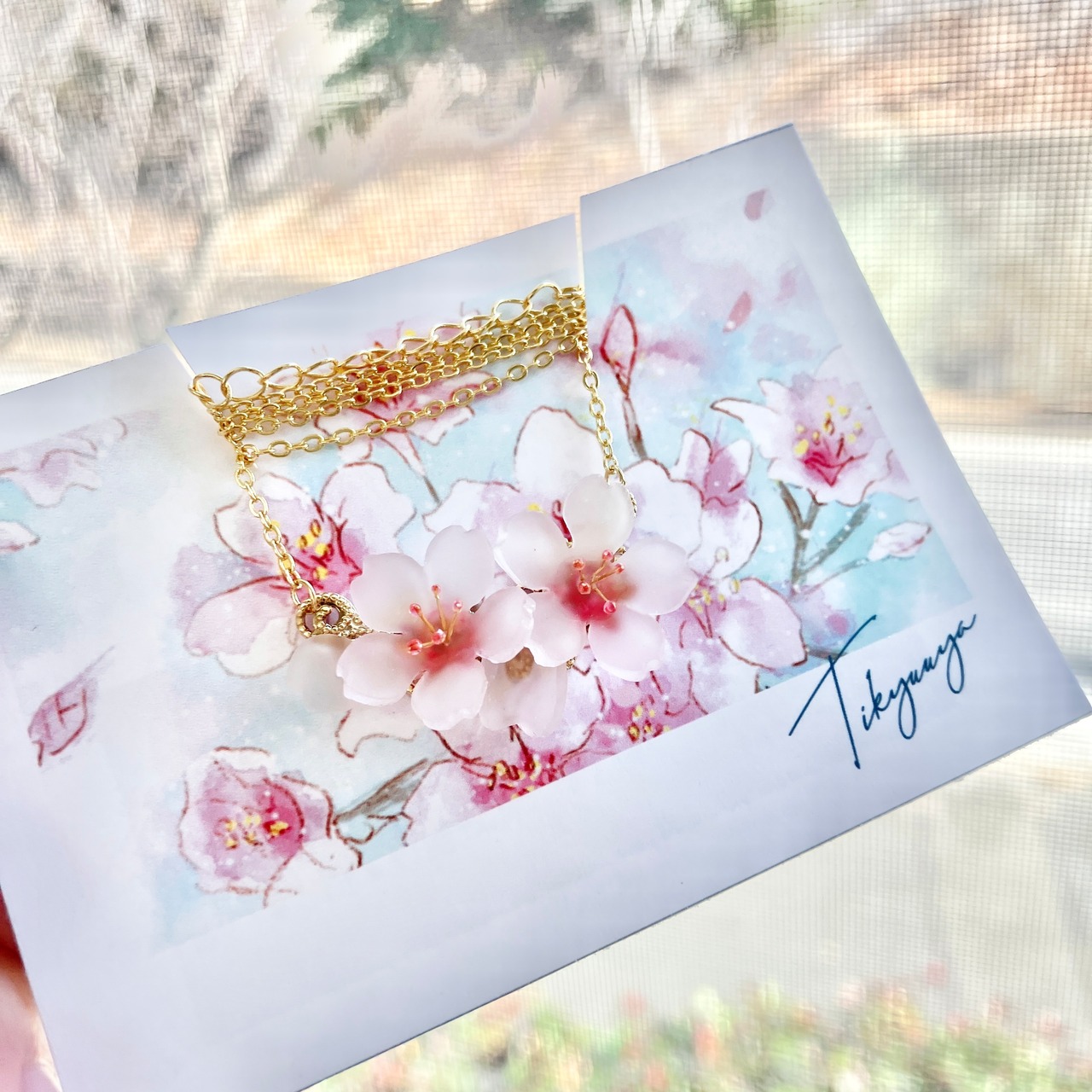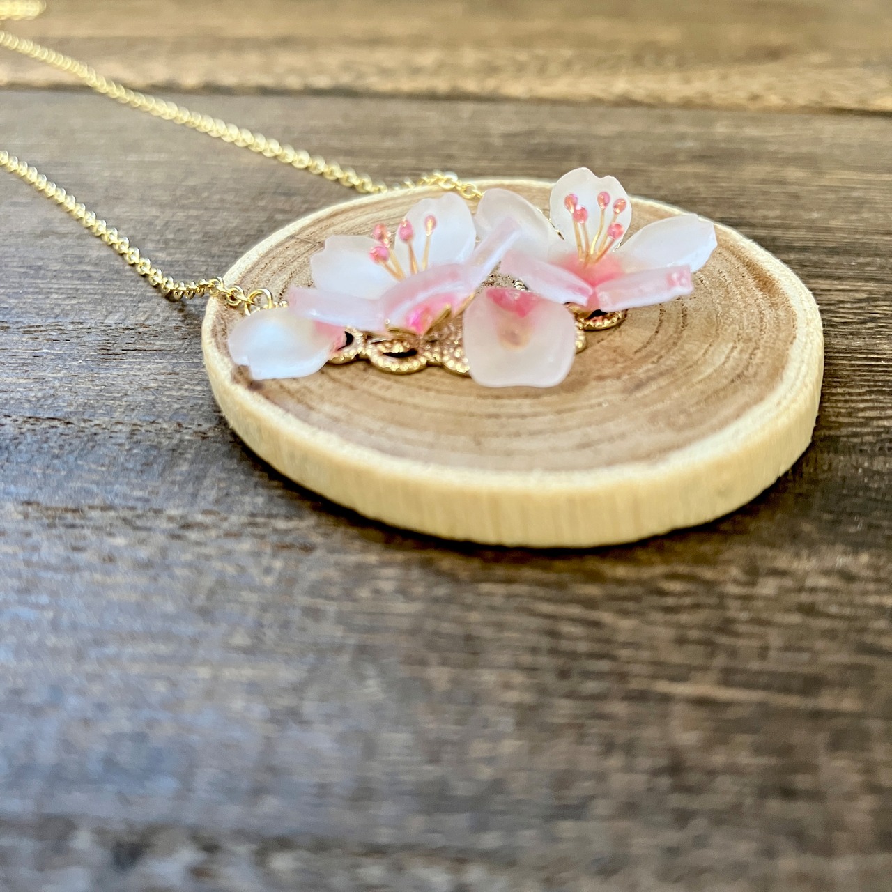 桜のモチーフを重ねて春にぴったりのネックレスに仕立てました。